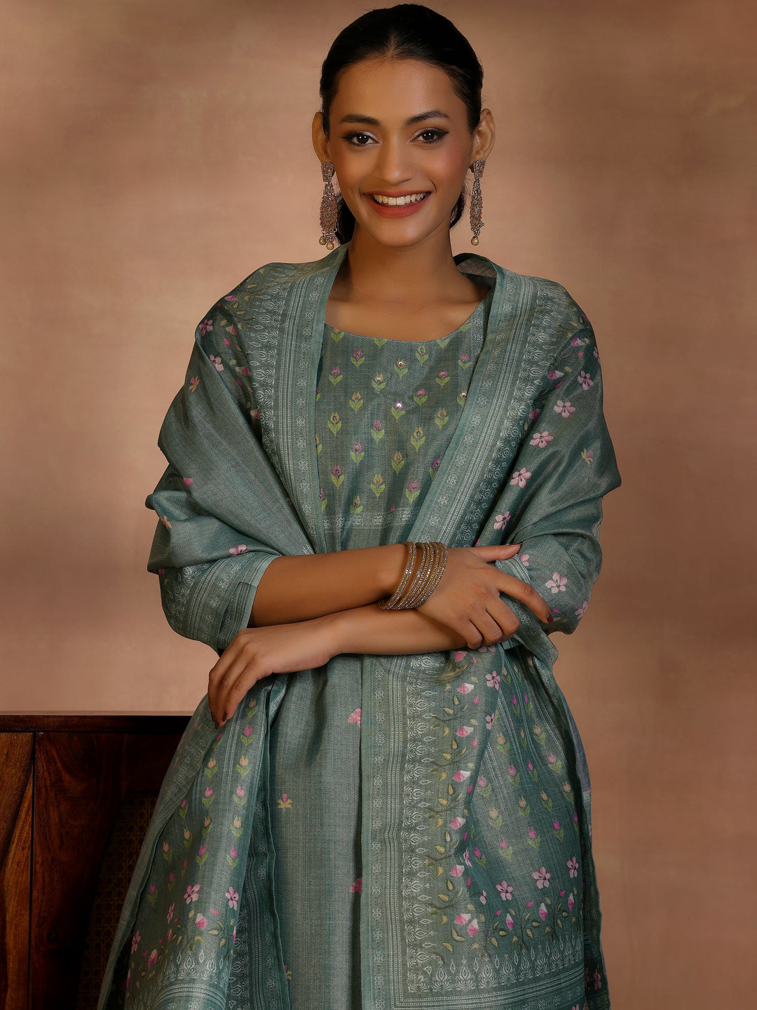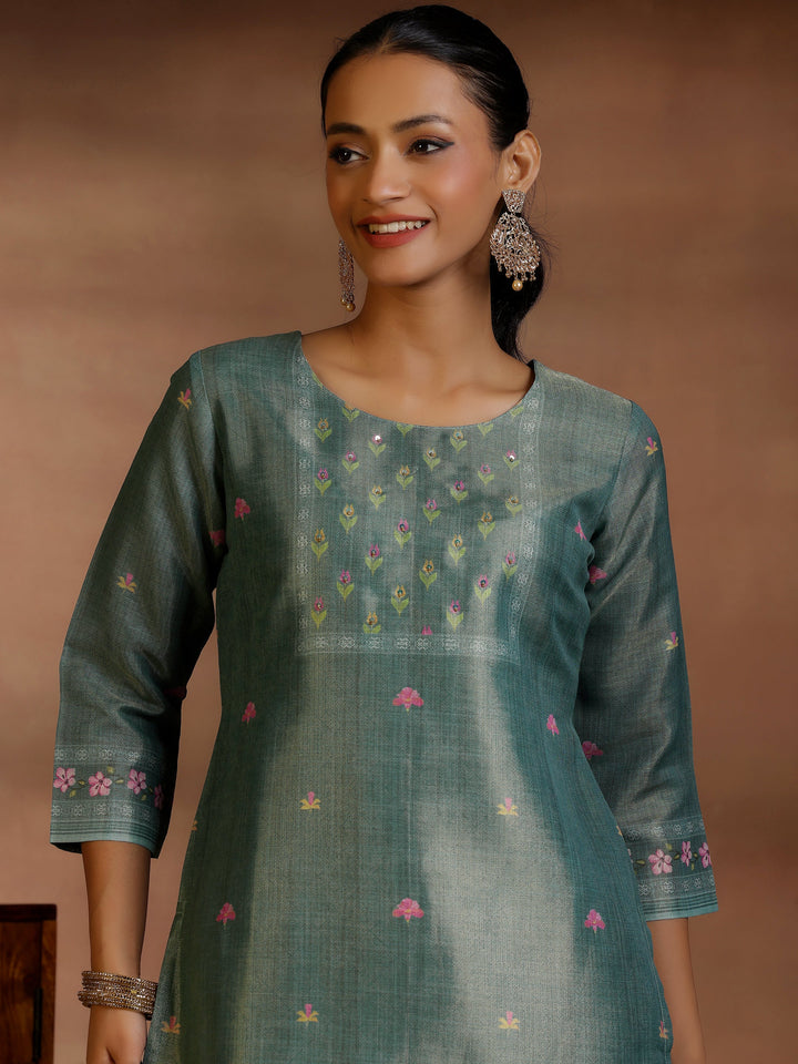 Green Printed Silk Blend Straight Suit With Dupatta