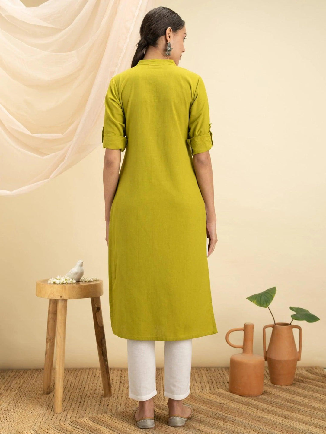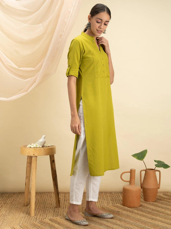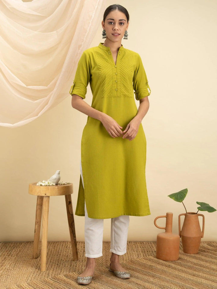 This green v-neck mandarin collar kurta is crafted in a straight cut with side slits. Made in cotton, detailed with delicate pin-tuck stitch, matching buttons, and roll-up sleeves for everyday ease.