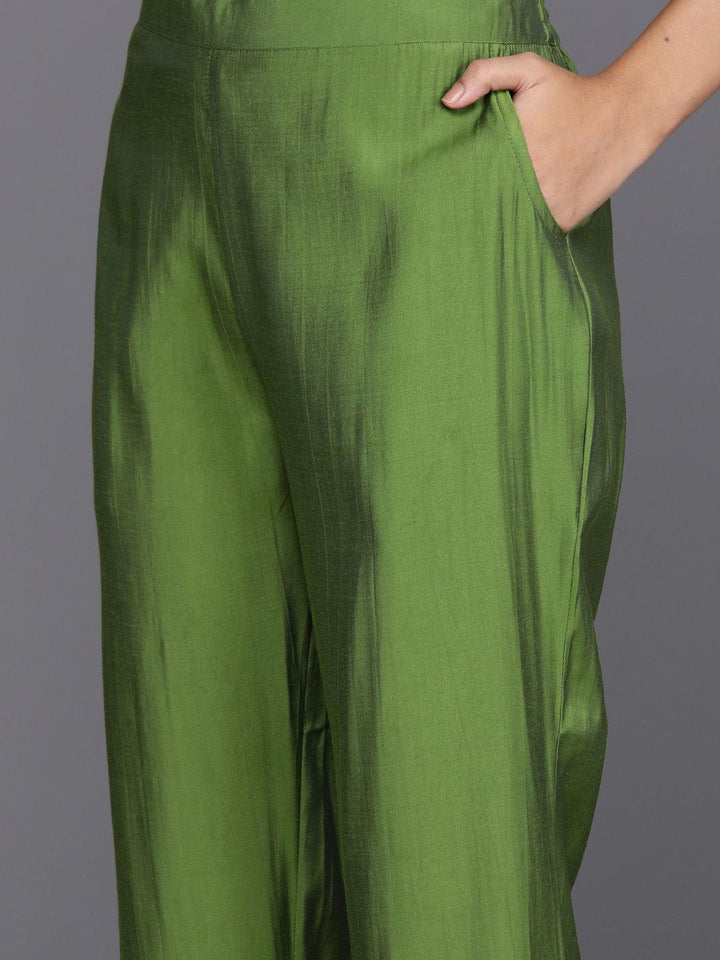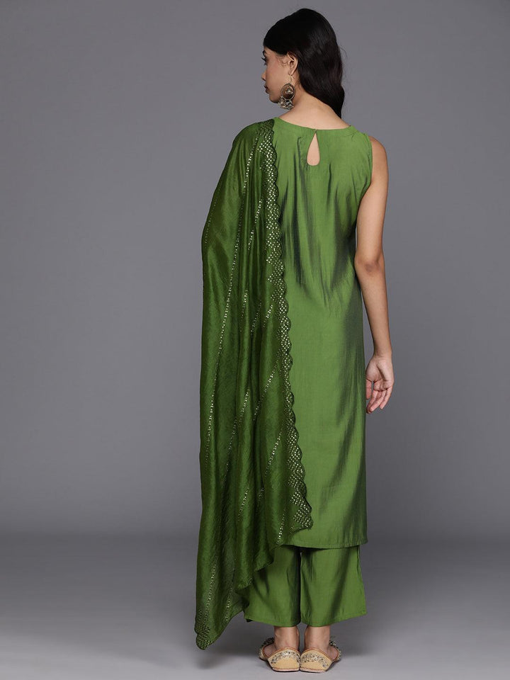 Green Solid Silk Blend Straight Kurta With Trousers & Dupatta - Libas