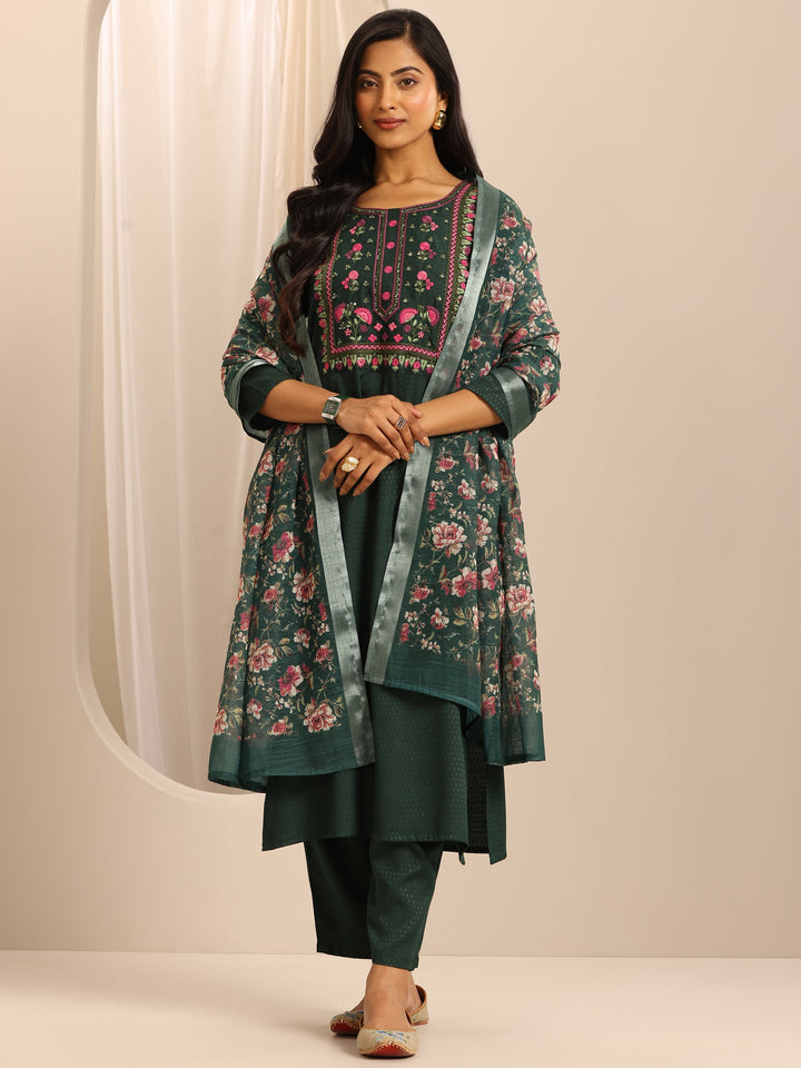 Green Woven Cotton Blend Straight Suit Set With Dupatta