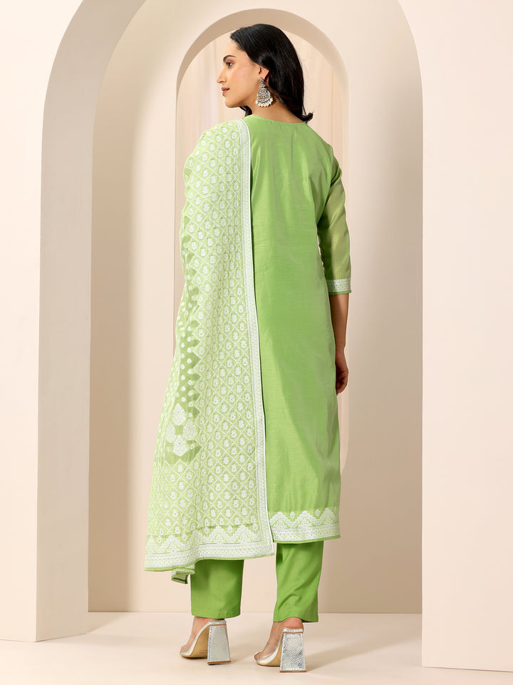 Green Woven Design Chanderi Silk Straight Suit Set With Dupatta