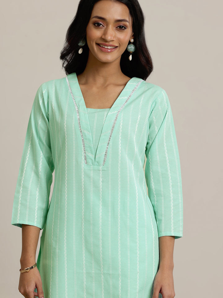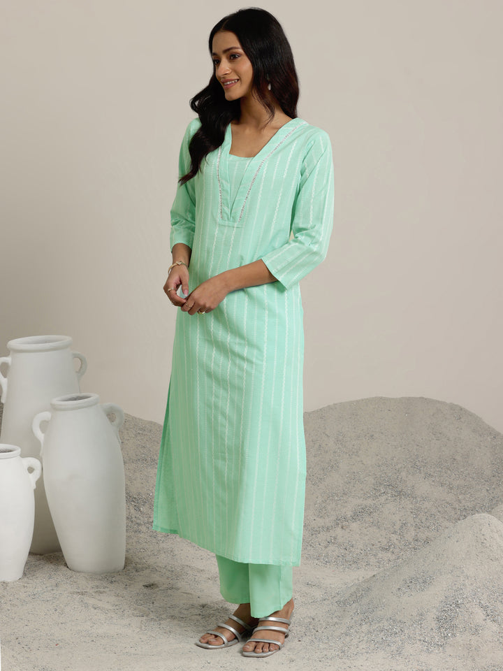 Our 3-piece green woven design cotton blend straight suit set features a kurta with a panelled V-neckline and three-quarter sleeves. Complemented with trousers with a partially elasticated waistband and roomy pockets, and a dupatta. Highlighted with cutwork and tassels, this style is perfect for casual outings.