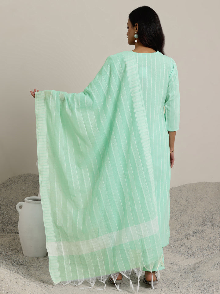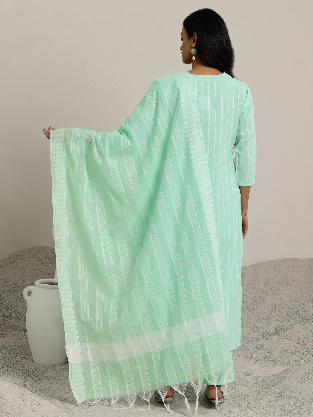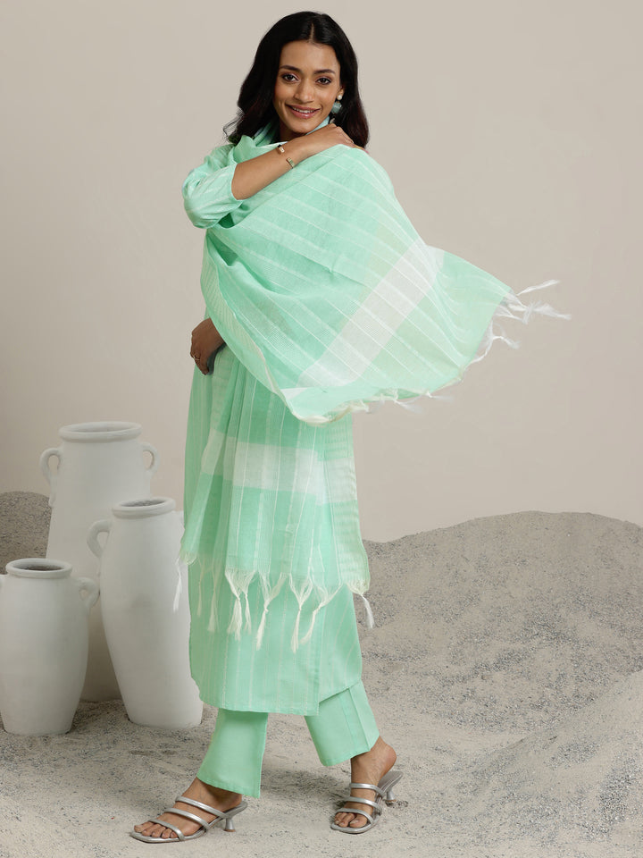 Green Woven Design Cotton Blend Straight Suits With Dupatta