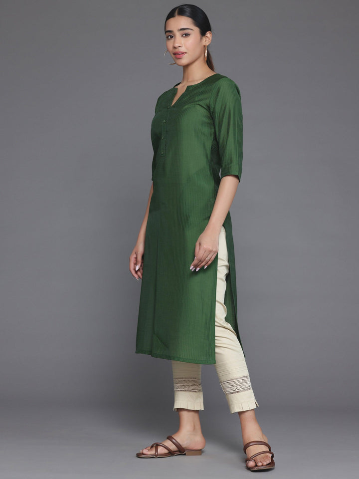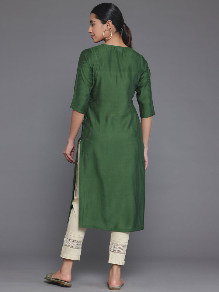 Our green striped silk kurta features a mandarin notched neckline and three-quarter sleeves. Elevated with stylish buttons and pocket detailing, this style is perfect for casual outings.