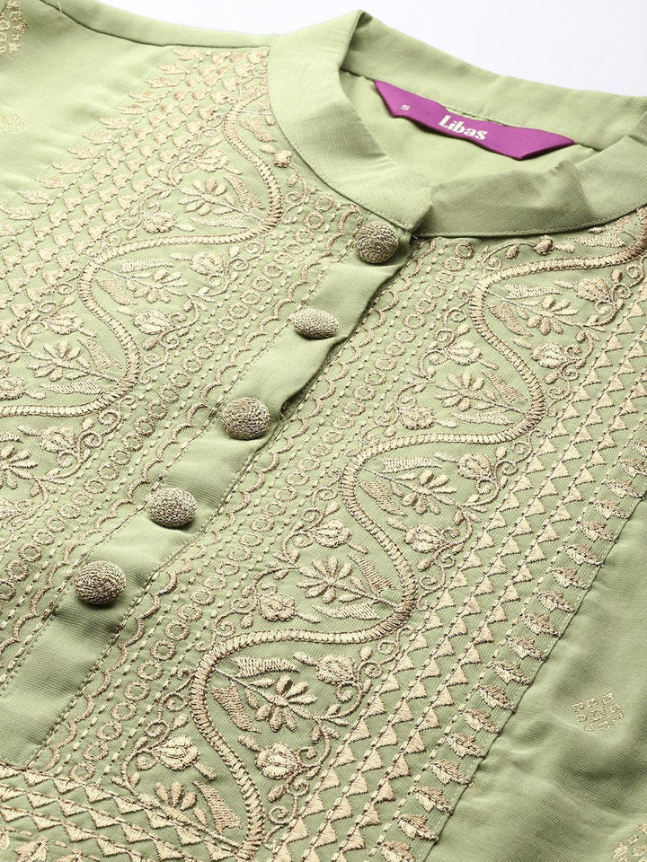 Our green printed straight fit kurta, crafted in sumptuous Chanderi silk fabric features a mandarin collar and three-quarter sleeves. Adorned with intricate embroidery and handmade fabric button accents, this elegant style is ideal for light festivities.