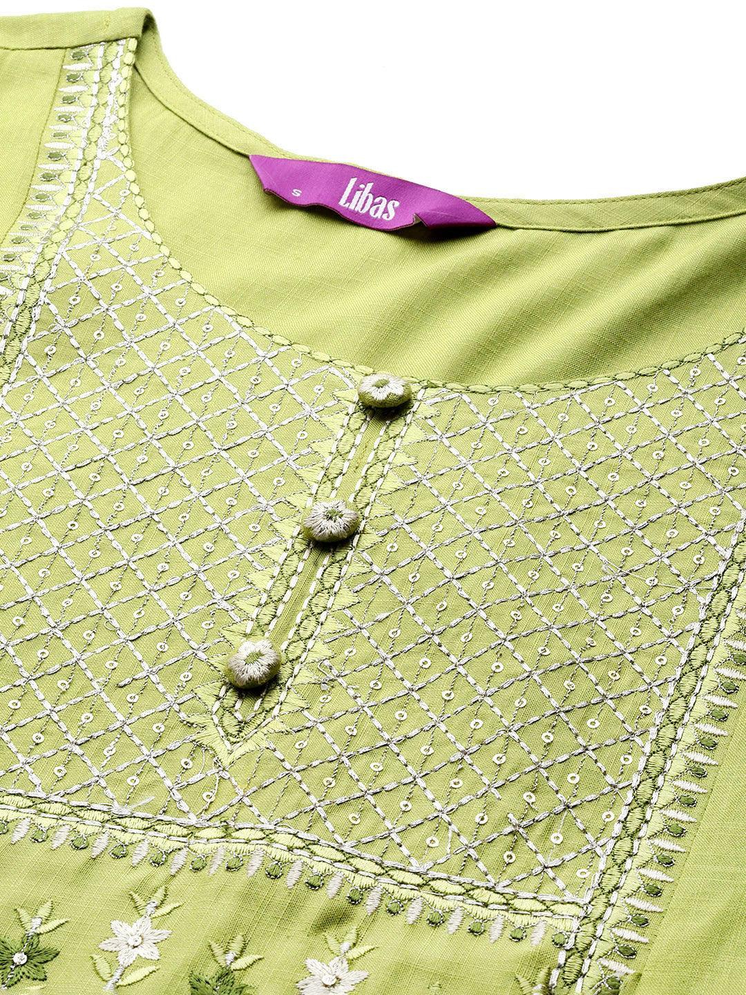 Our green viscose pleated A-line kurta features a round neck, embellished yoke design, and regular three-quarter sleeves. Adorned with intricate Zari detailing, this style is perfect for light festivities.
