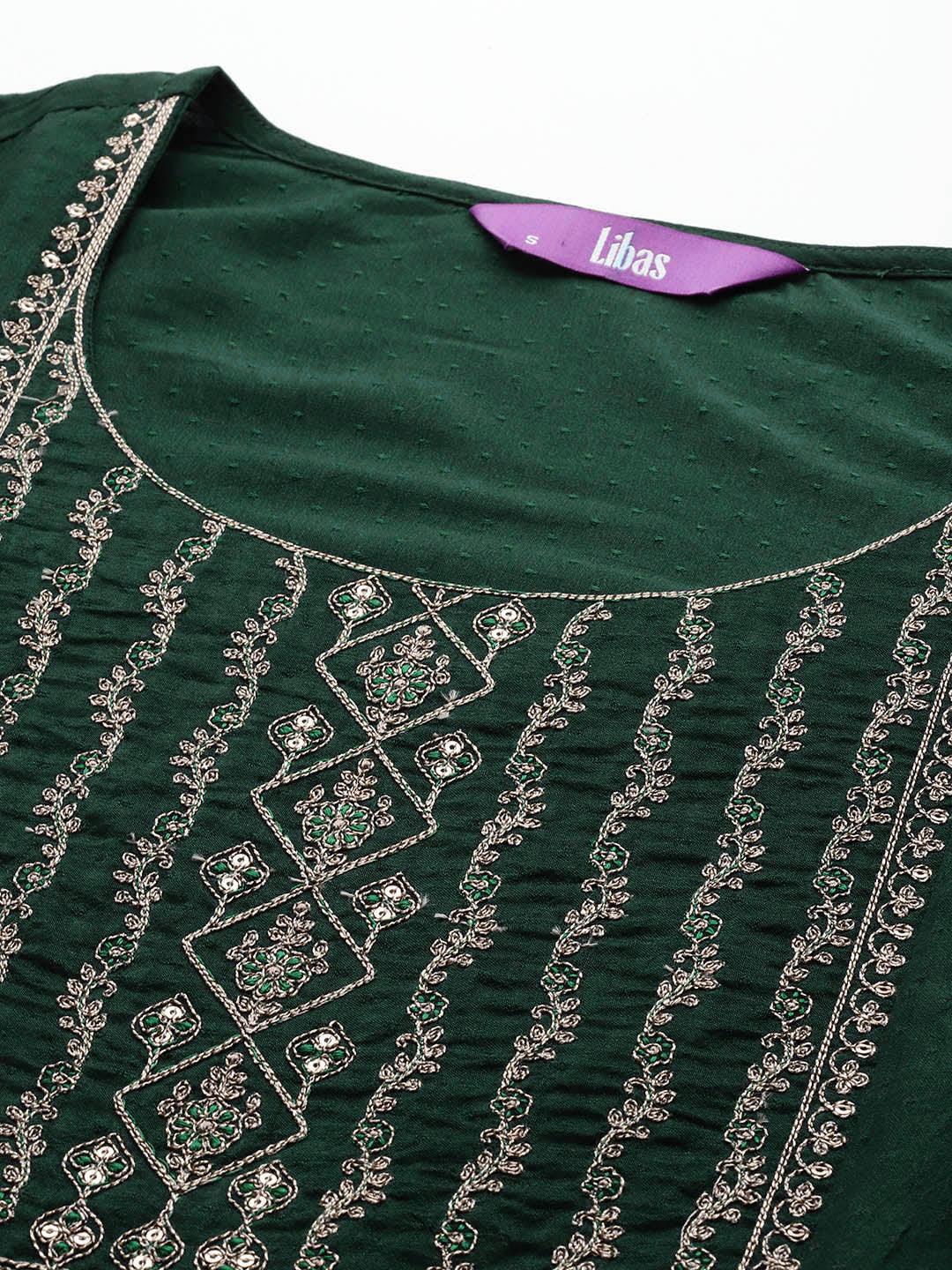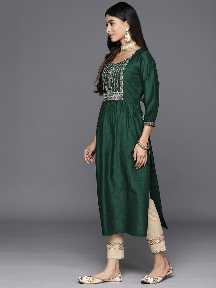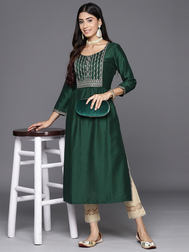 Our emerald green A-line kurta with panelled style features a round neck, floral embellished yoke design, and regular three-quarter sleeves. Adorned with sequinned details, this style is perfect for elevated everyday wear.