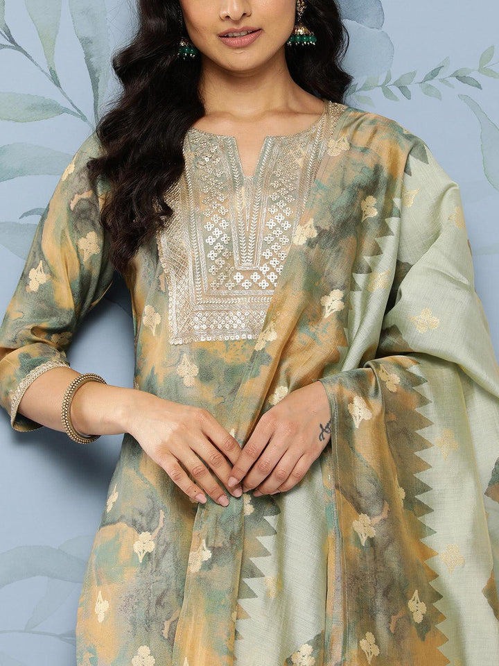 Green Yoke Design Silk Blend Straight Kurta With Trousers & Dupatta