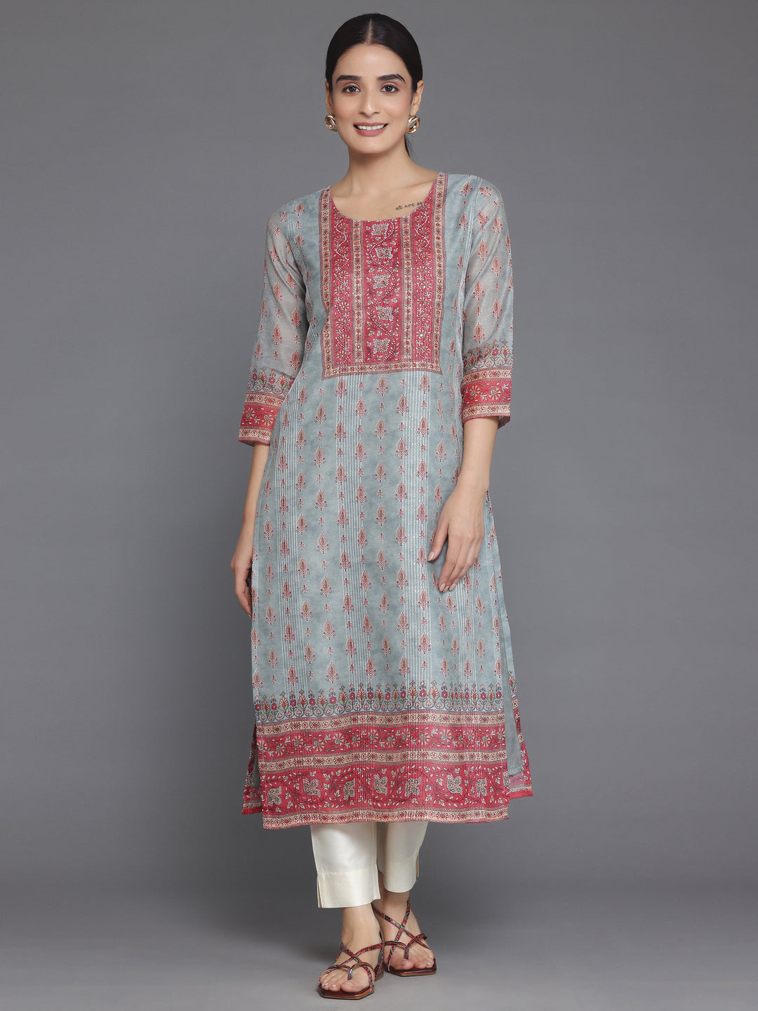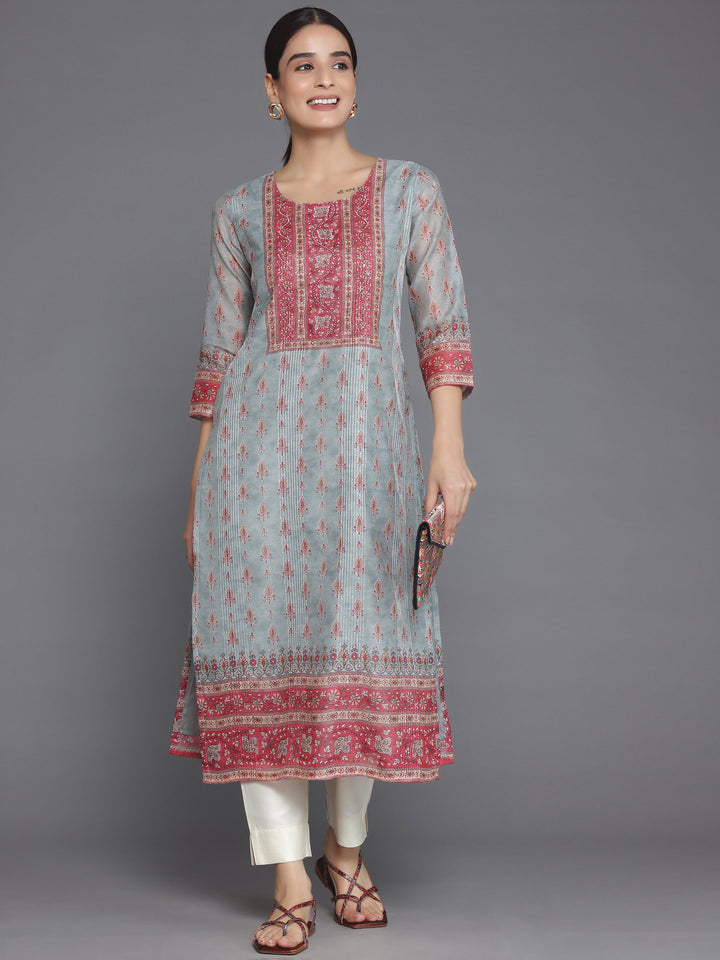 Our grey Chanderi silk straight-fit kurta features a round neckline, three-quarter sleeves, and a statement yoke. Elevated with ethnic motifs print, this style is ideal for casual outings.