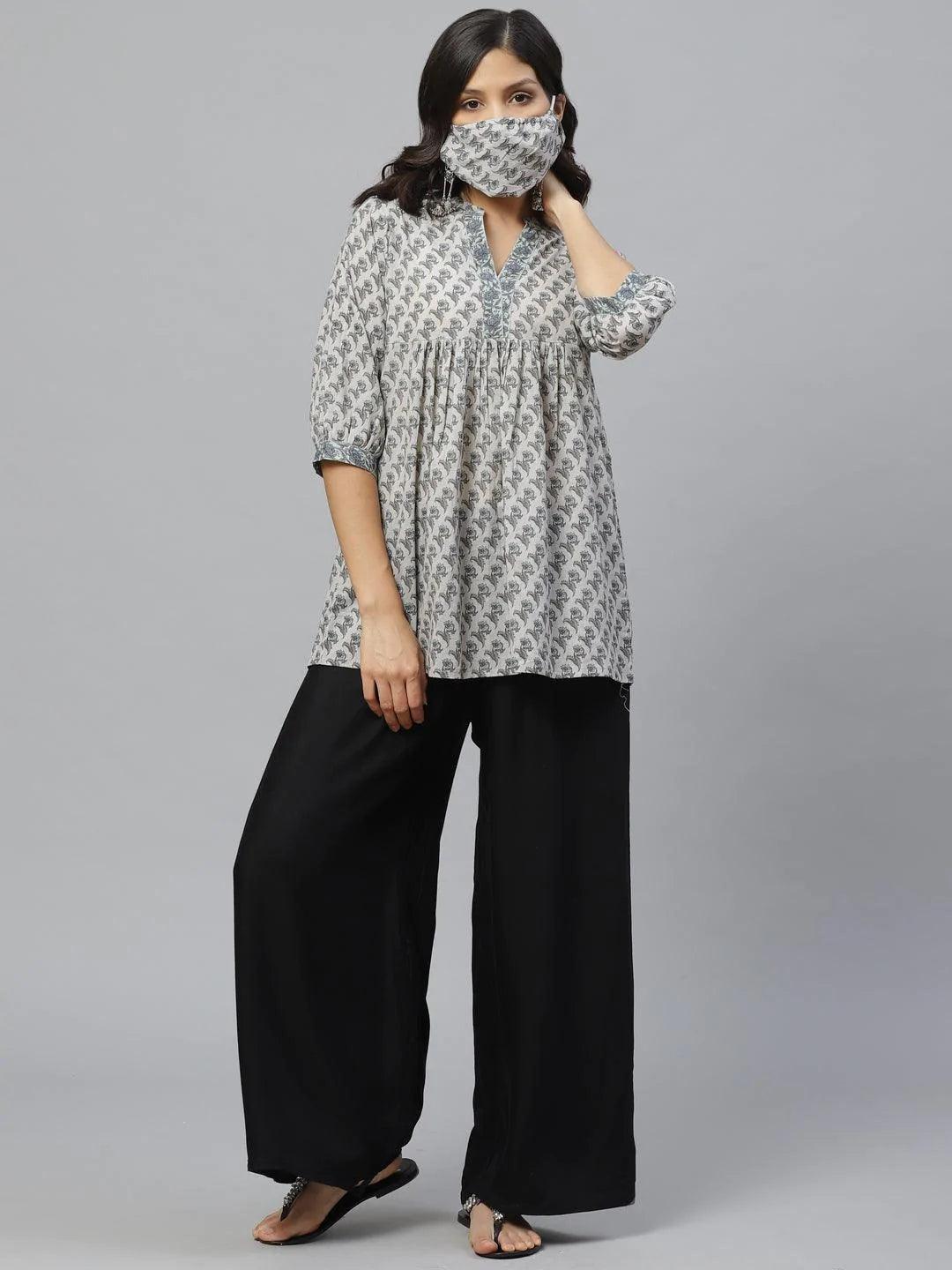 Grey Printed Cotton Kurti With Mask - ShopLibas