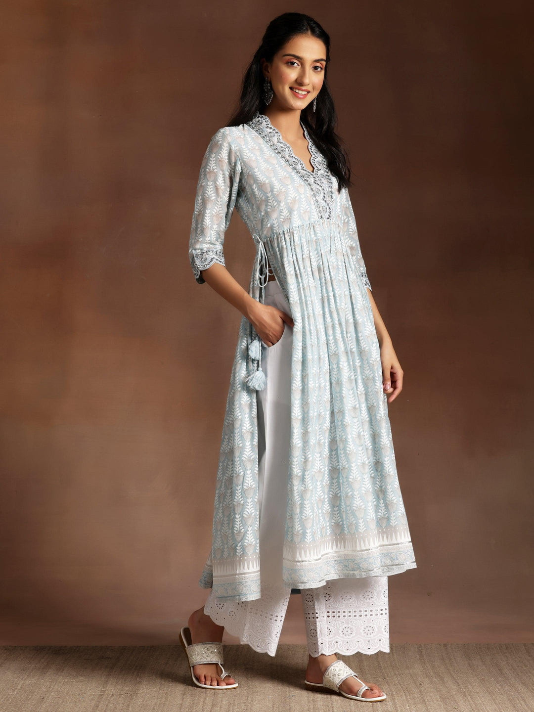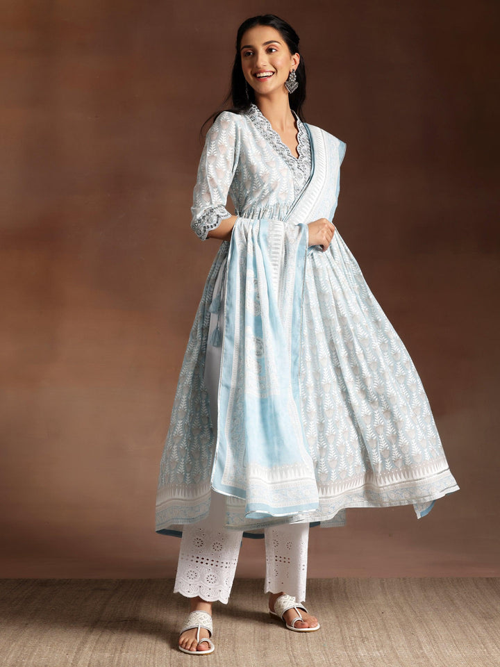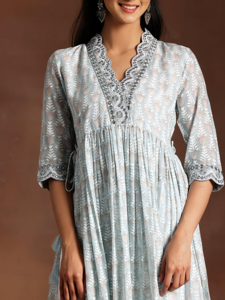 Grey Printed Cotton A-Line Kurta With Palazzos & Dupatta - ShopLibas