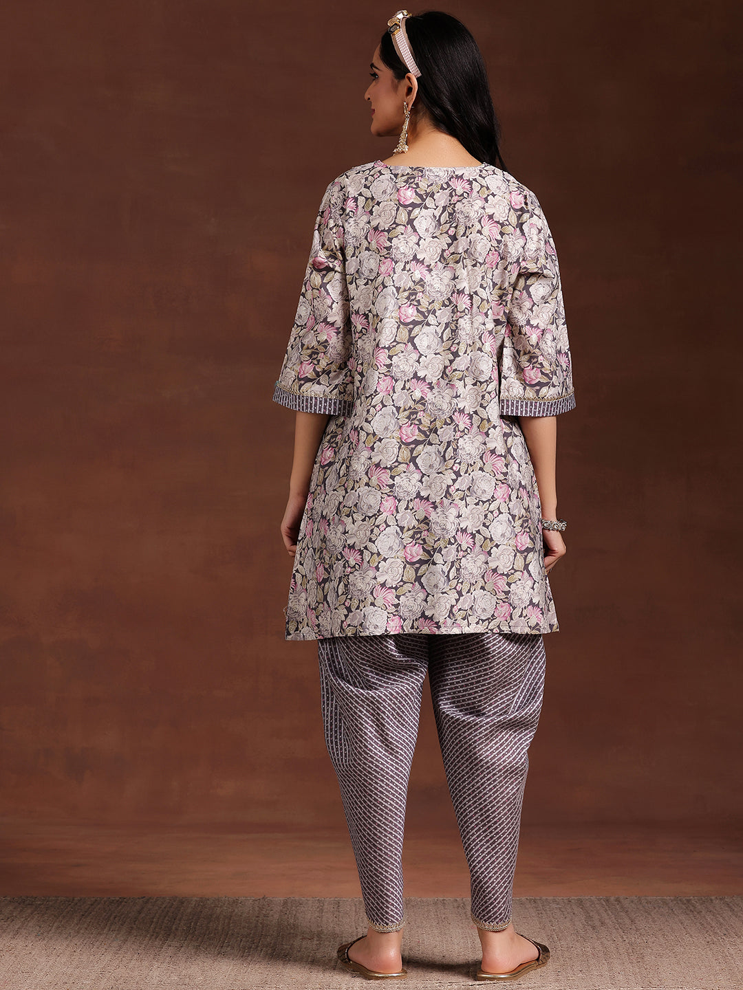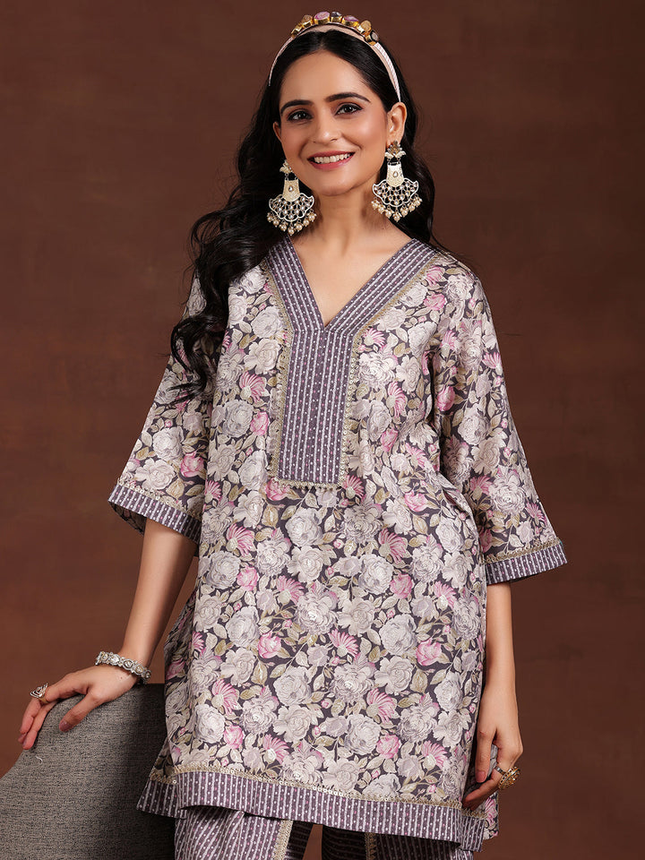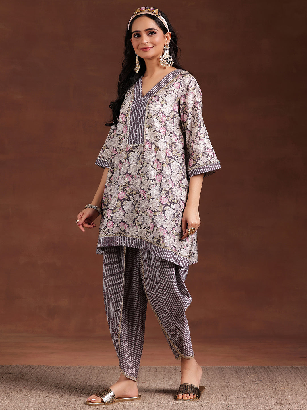 Our 2-piece grey printed silk blend kurta set features an A-line kurta with a V-neckline, three-quarter sleeves, and a statement yoke. Complemented with stylish Dhoti trousers with a partially elasticated waistband. Elevated with Gota Patti and fabric-trim detailing, this style is perfect for light festivities.