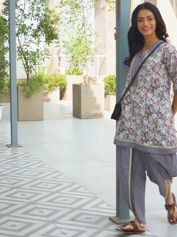 Grey Printed Silk Blend A-Line Kurta With Dhoti Pants