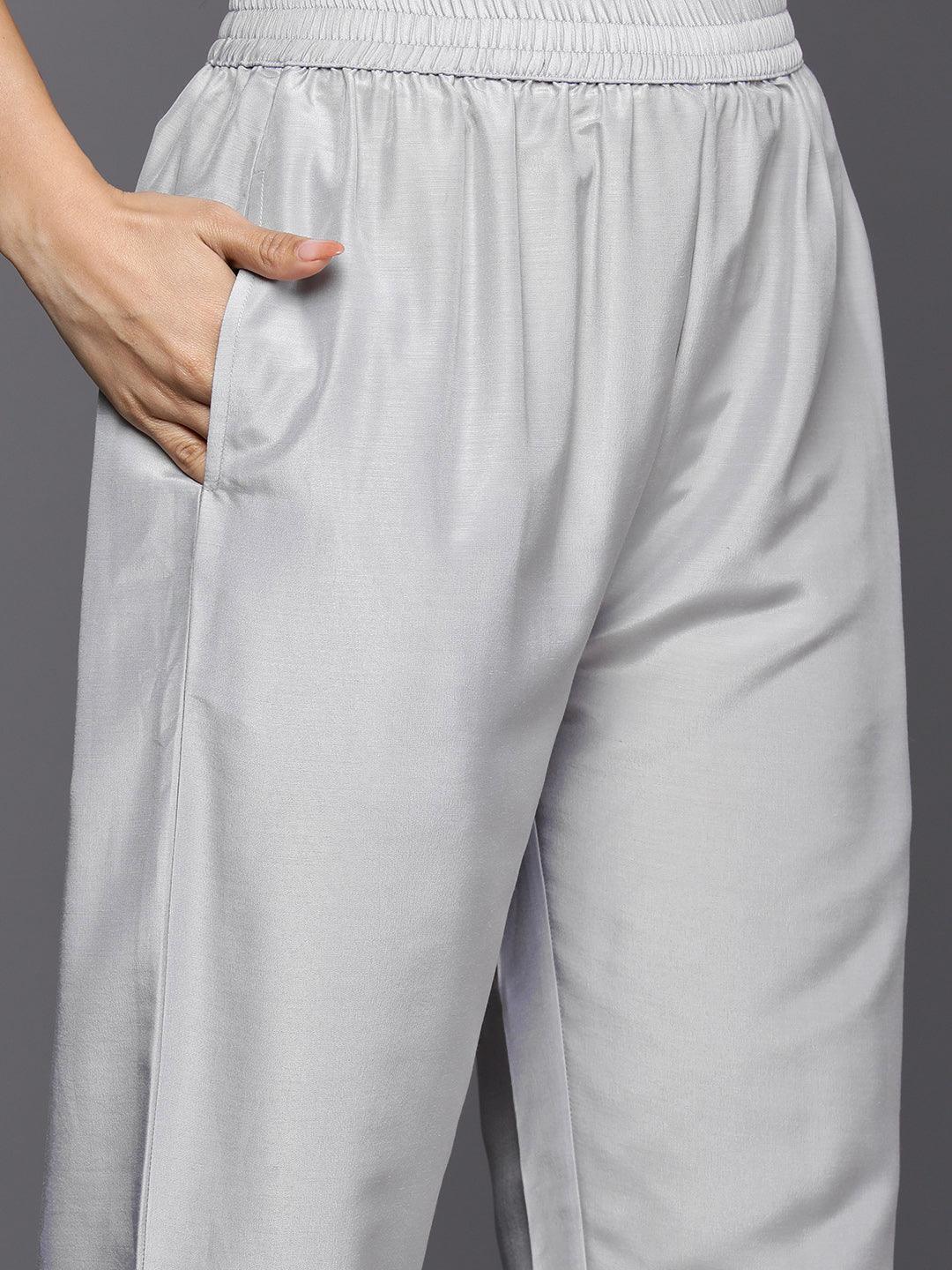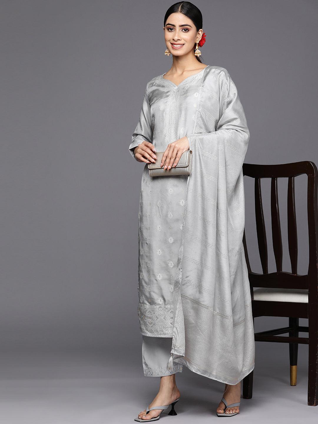 Grey Self Design Silk Blend Straight Suit Set With Trousers - ShopLibas