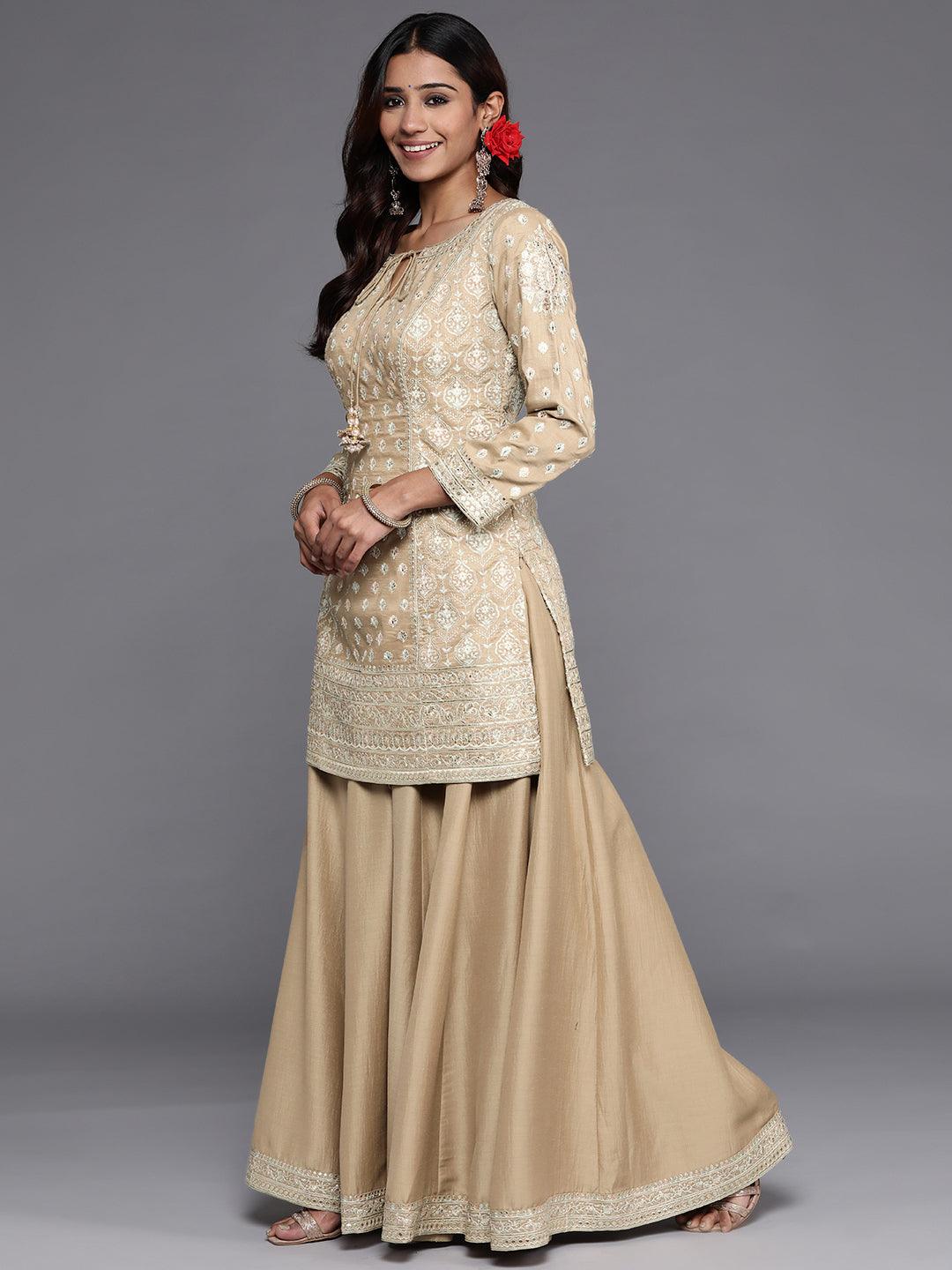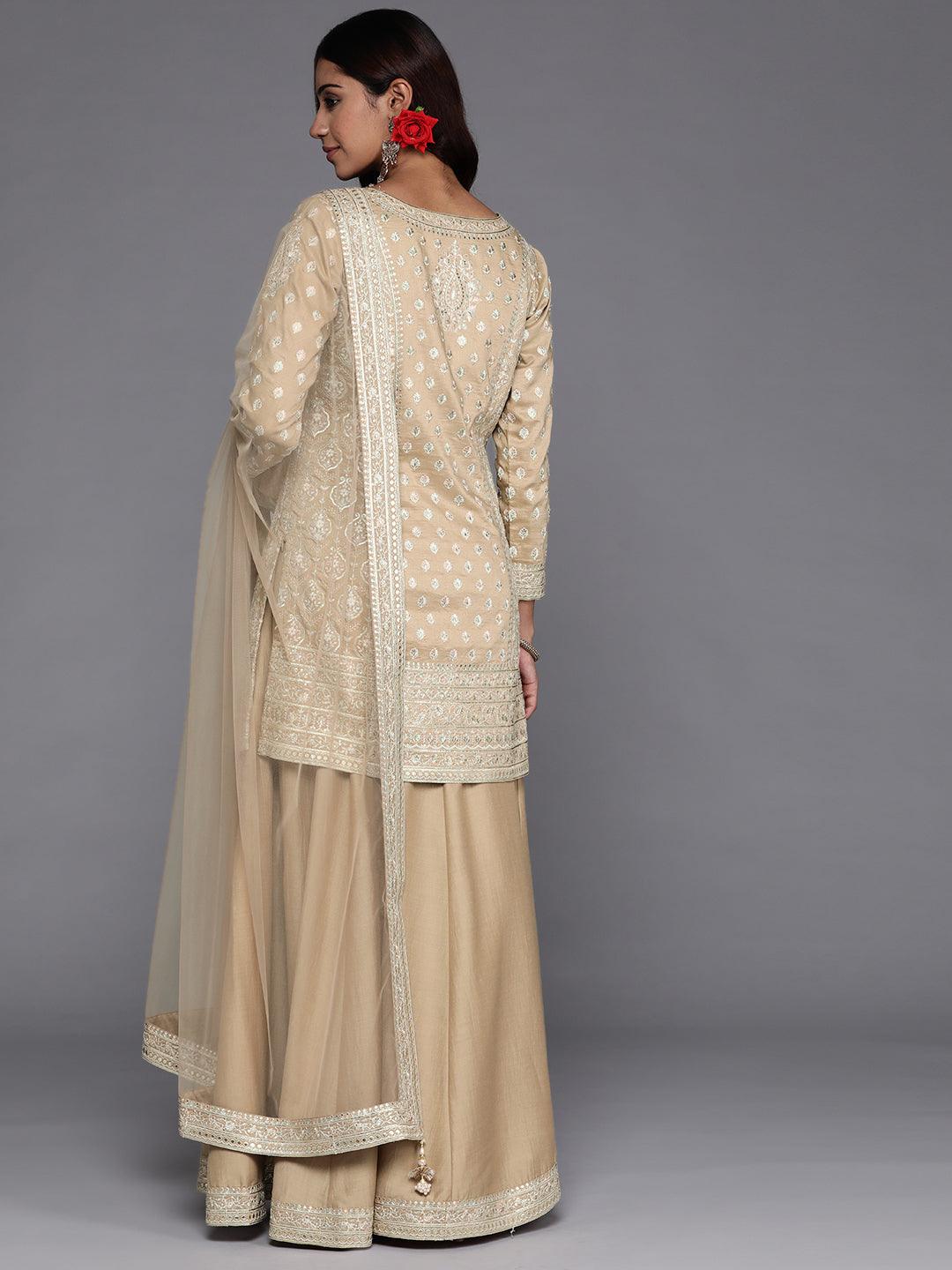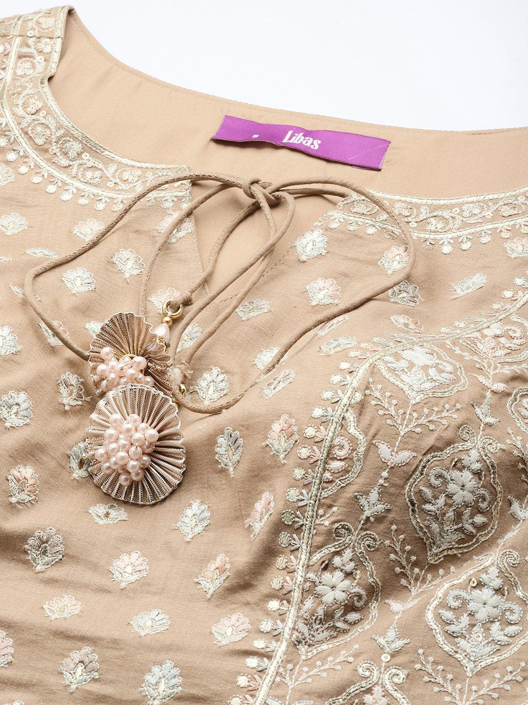 Libas Art Beige Embroidered Silk Straight Suit Set