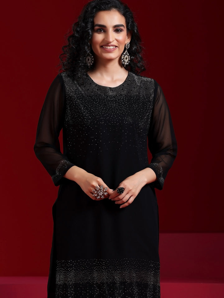 Our 3-piece black embellished georgette suit set features a straight-fit round neck kurta with three-quarter sleeves. Complemented with trousers with a partially elasticated waistband, and a dupatta. Elevated with rhinestones, this style is perfect for festive celebrations.