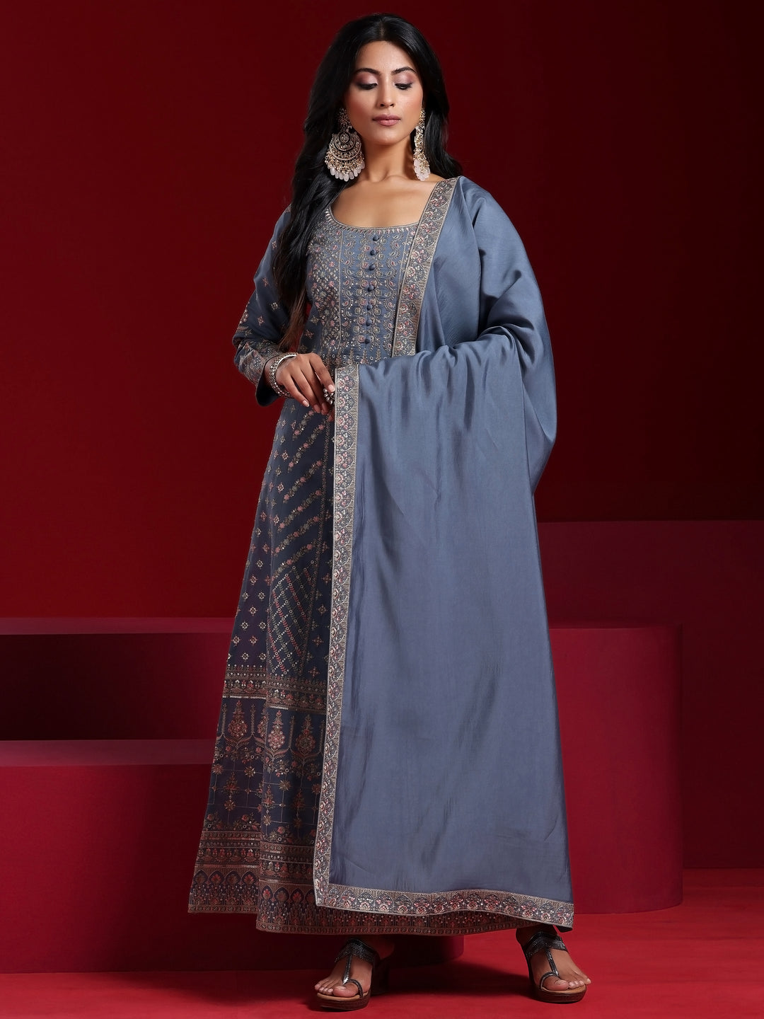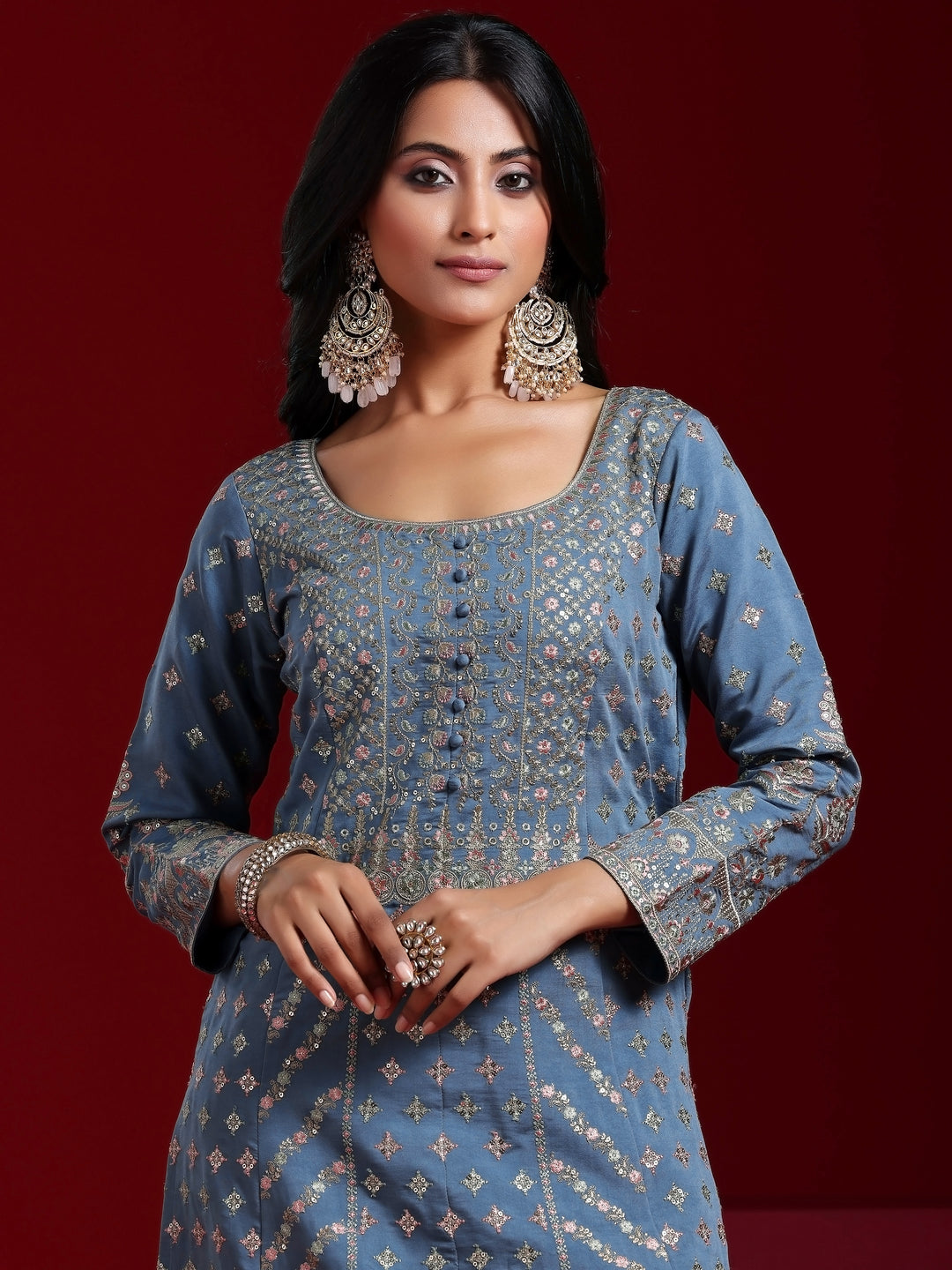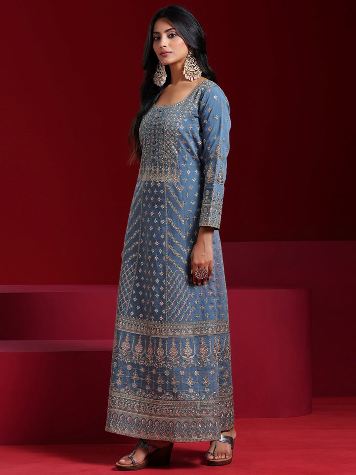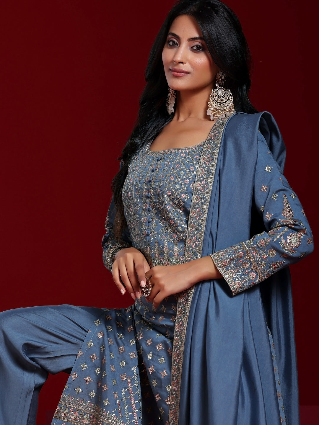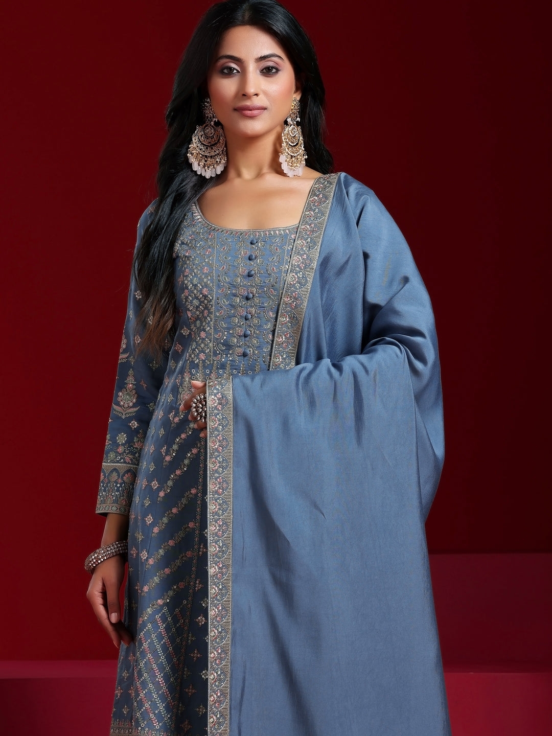 Libas Art Blue Embroidered Silk Blend A-Line Kurta With Trousers & Dupatta