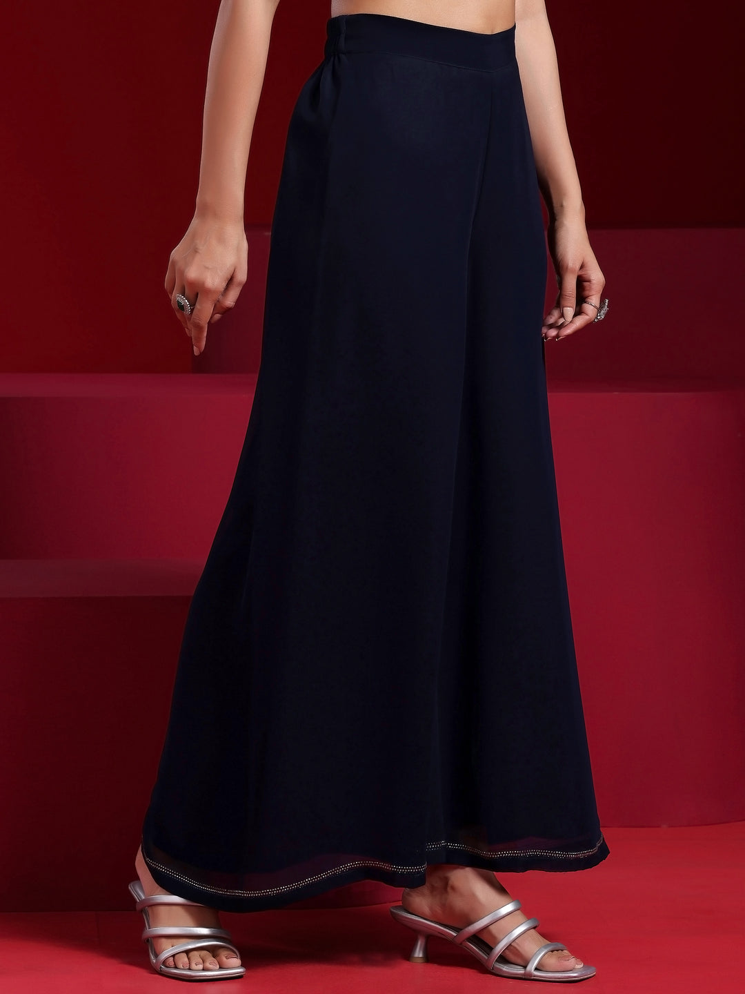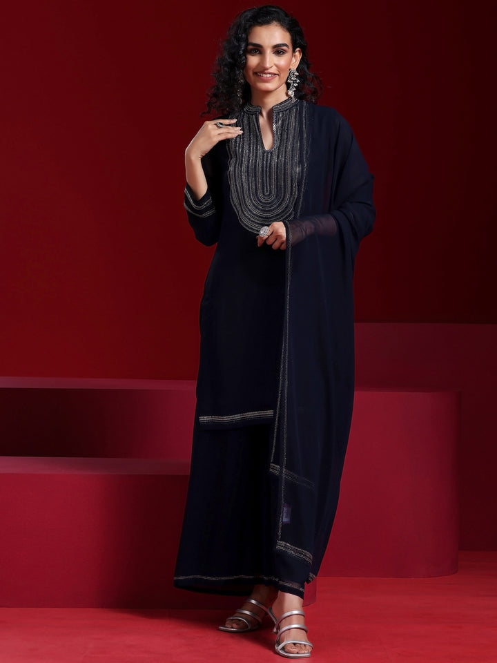 Our 3-piece blue embellished georgette suit set features a straight-fit kurta with a mandarin notched neckline, three-quarter sleeves, and a statement yoke. Complemented with flared palazzo pants with partially elasticated waistband and dupatta. Adorned with sequins and beaded accents, this style is perfect for light festivities.