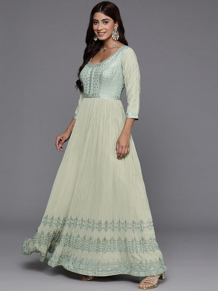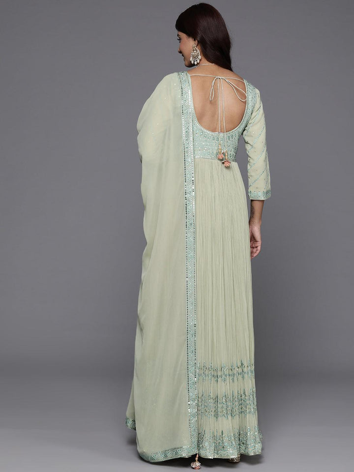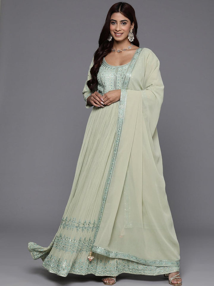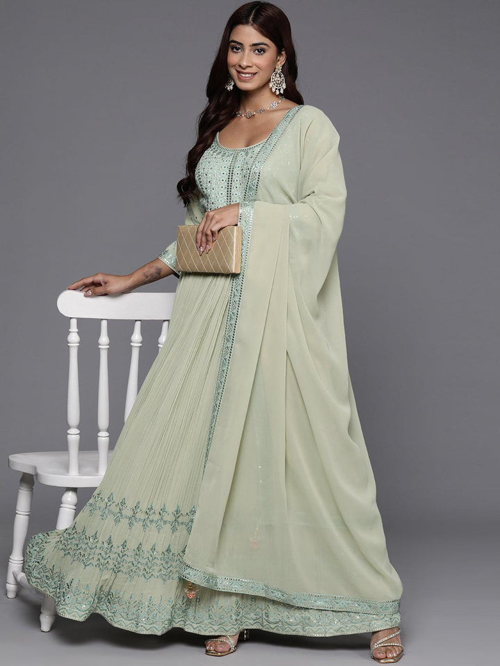 Libas Art Green Embroidered Georgette Anarkali Kurta With Trousers & Dupatta