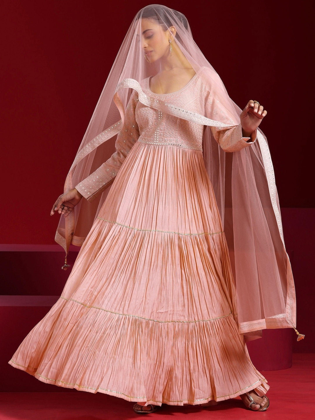 Our 3-piece peach embroidered cotton blend suit set features a tiered A-line kurta with a round neckline and comfortable full sleeves. Complemented with trousers with a partially elasticated waistband and roomy pockets, and a net dupatta. Highlighted with mirror accents, intricate thread work, and Gota Patti detailing, this style is perfect for festive celebrations.
