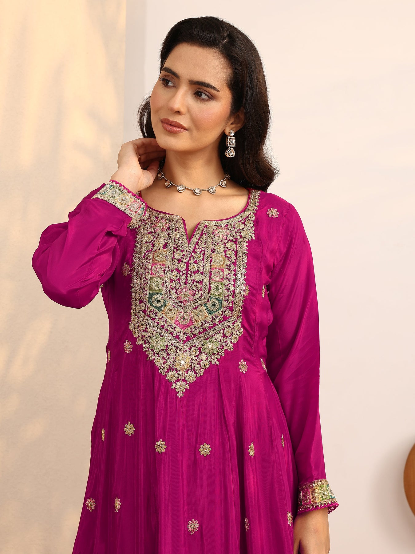 Our 3-piece magenta crepe Anarkali kurta set features a round neckline, regular sleeves, and statement yoke. Complemented with lining and straight pants with a partially elasticated waistband and 2 pockets, and an embroidered dupatta. Adorned with embellished, this style is perfect for dark festive occasions.