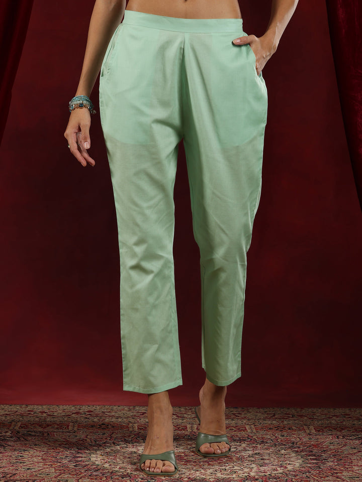 Our 3-piece sea green embroidered yoke design Chanderi silk straight suit set features a kurta with a notched neckline and three-quarter sleeves. Complemented with trousers with a partially elasticated waistband and roomy pockets, and a dupatta. Highlighted with intricate embroidery and delicate tassels, this style is perfect for festive celebrations.