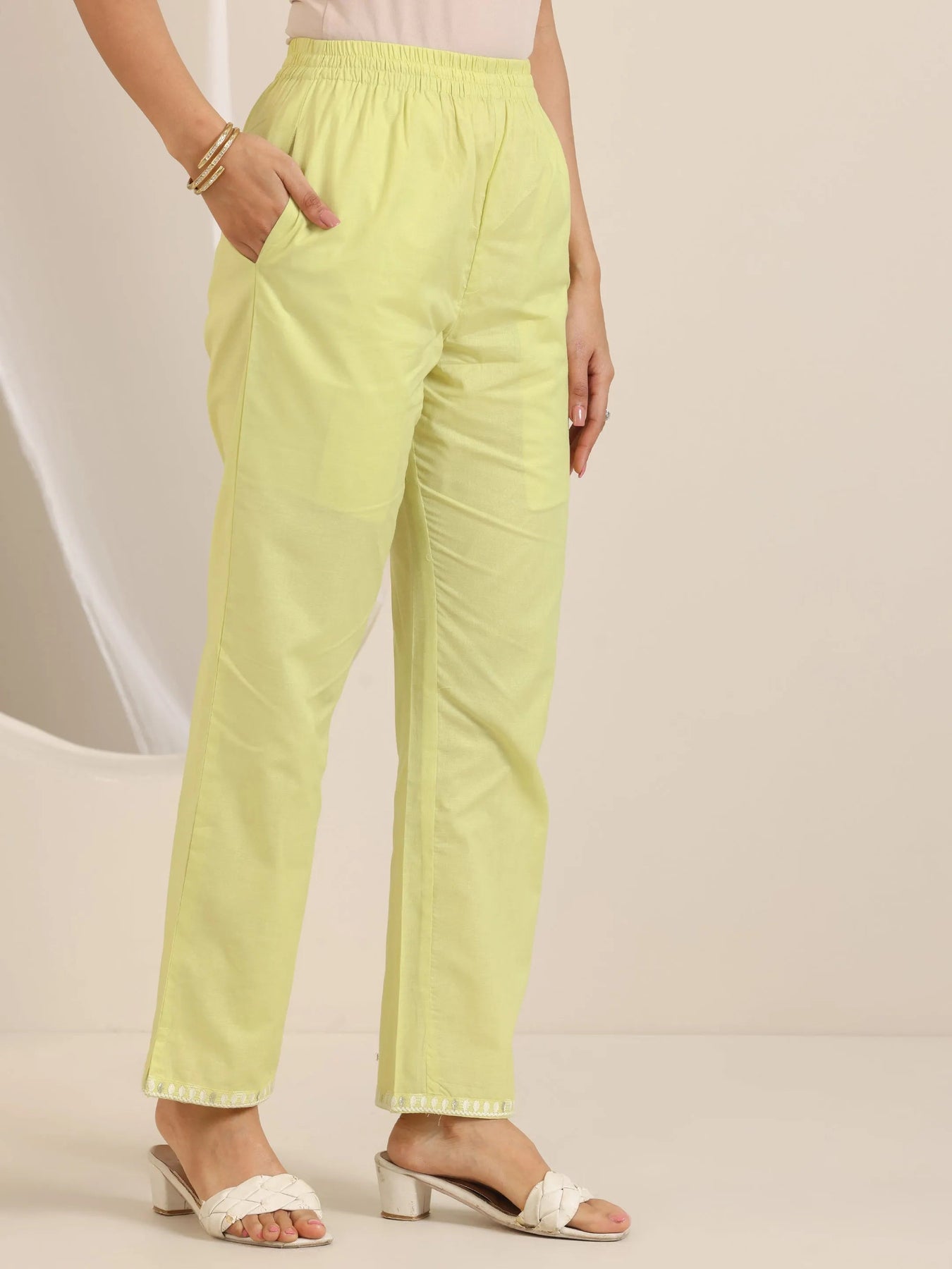 Our 3-piece lime green pure cotton suit set features a straight-fit kurta set with a round neckline, regular sleeves, and statement yoke. Complemented with straight pants with an elasticated waistband and a solid dupatta. Adorned with embroidered accents, this style is perfect for casual occasions.