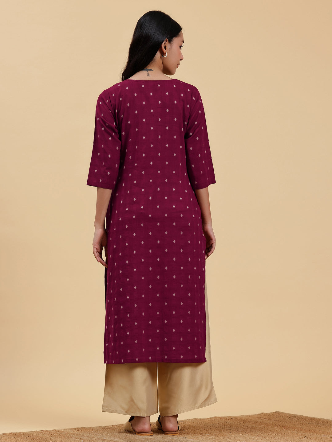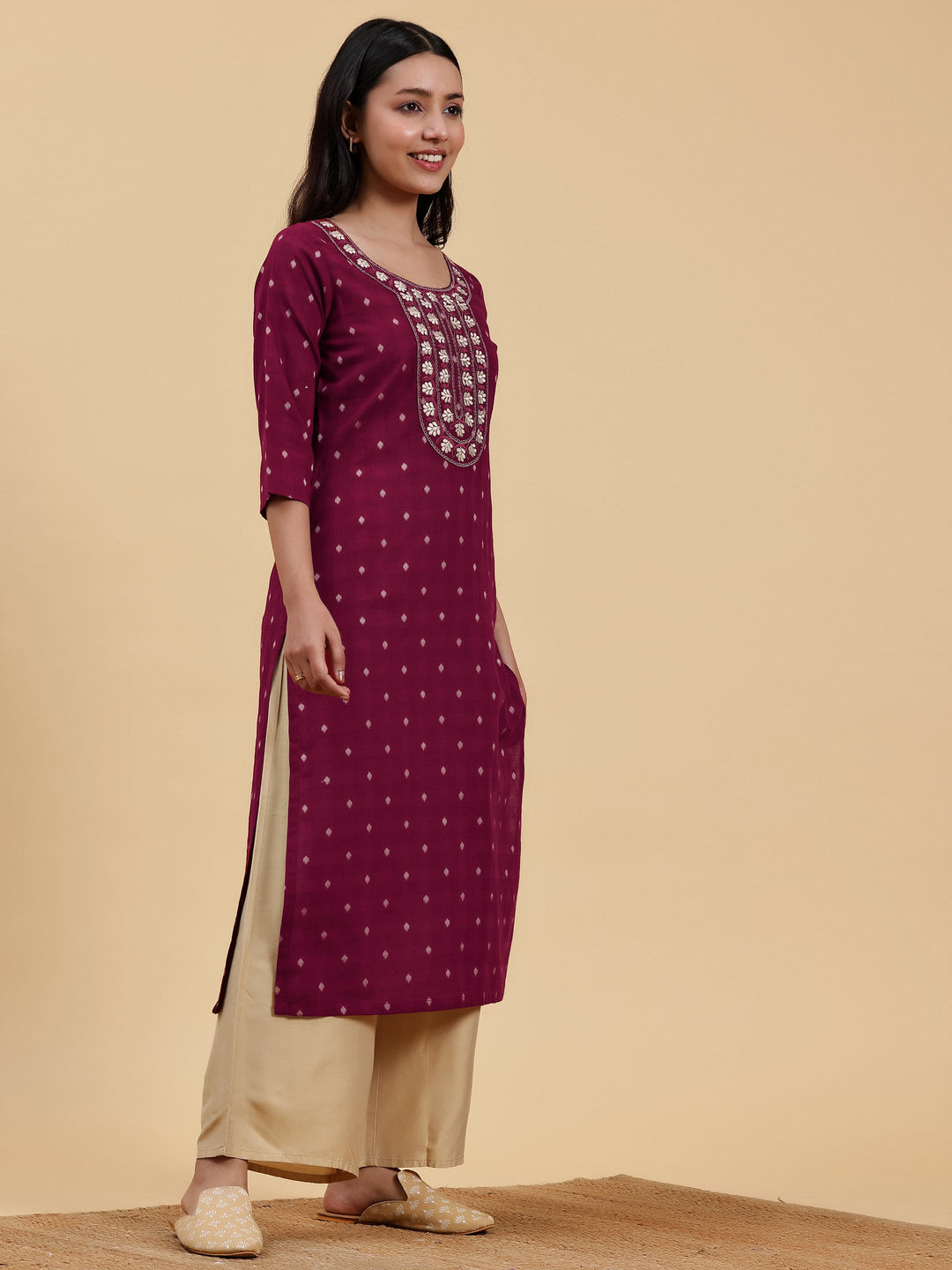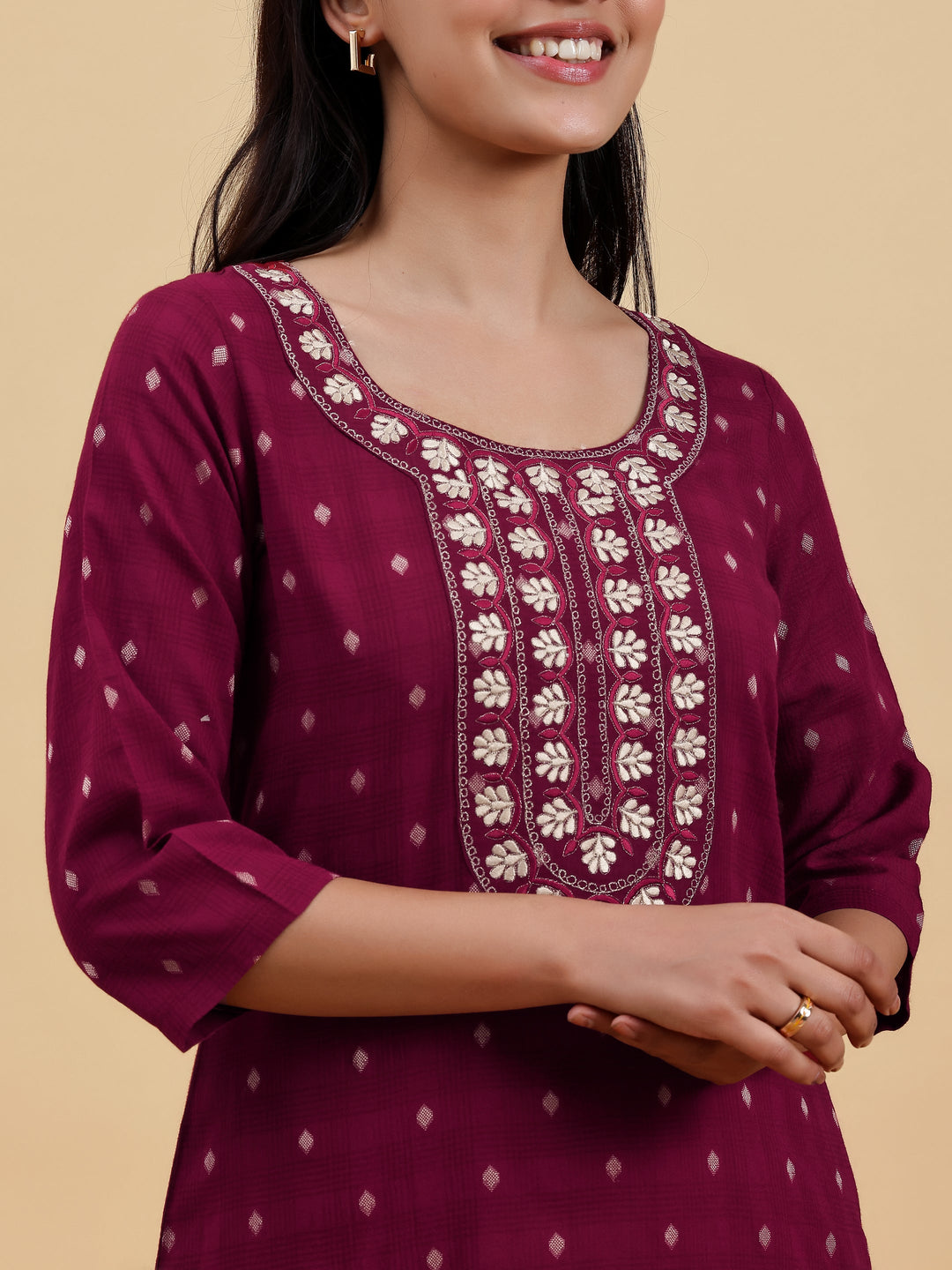 Our maroon embroidered kurta, crafted in cotton fabric, features a round neckline, three-quarter sleeves, and a statement yoke. Elevated with intricate thread work, this style is perfect for casual outings.