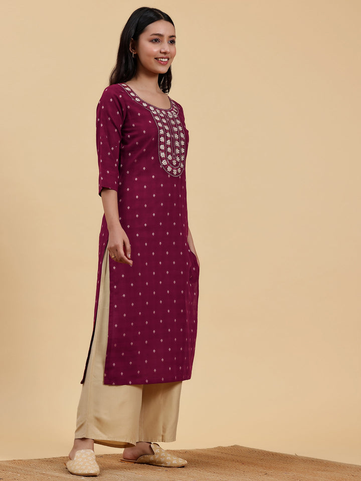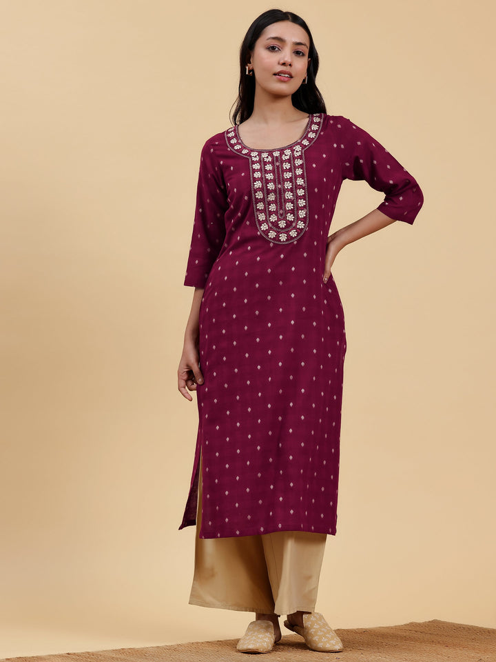 Maroon Embroidered Cotton Straight Kurta