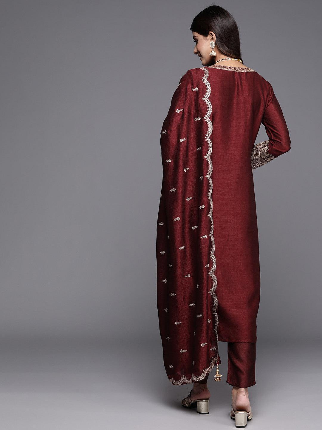 Our 3-piece maroon red solid-tone embroidered silk blend suit set features a straight-fit kurta with a round neckline and comfortable full sleeves. Complemented with trousers with a partially elasticated waistband and roomy pockets, and a dupatta. Adorned with elaborate embroidery, sequins accents, and tassel detailing, this style is perfect for festive celebrations.