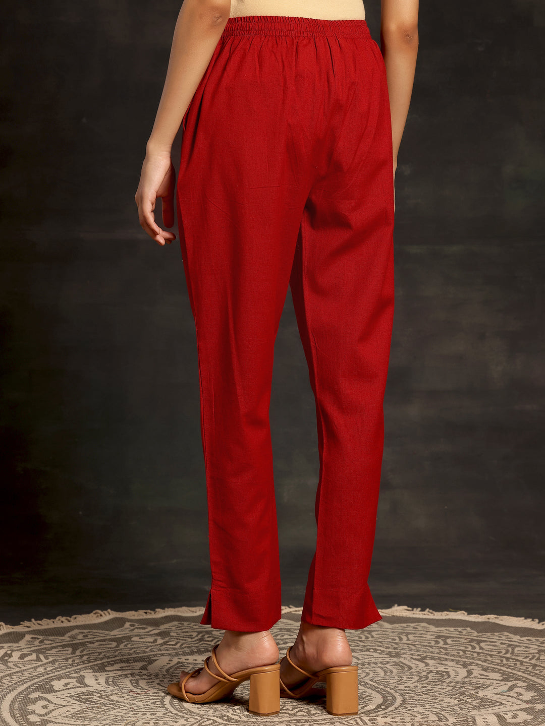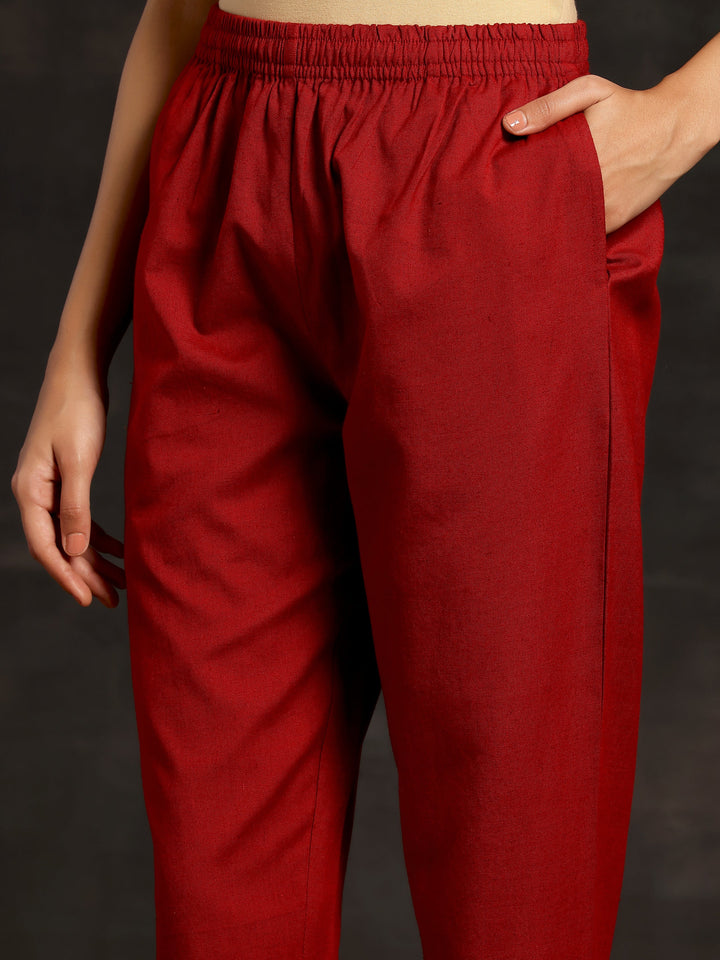 Our maroon mid-rise trousers, crafted in cotton fabric, feature a fully elasticated waistband and roomy pockets are an ideal fit for light festivities.