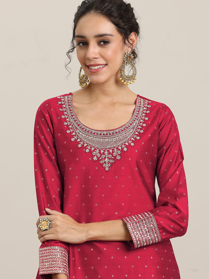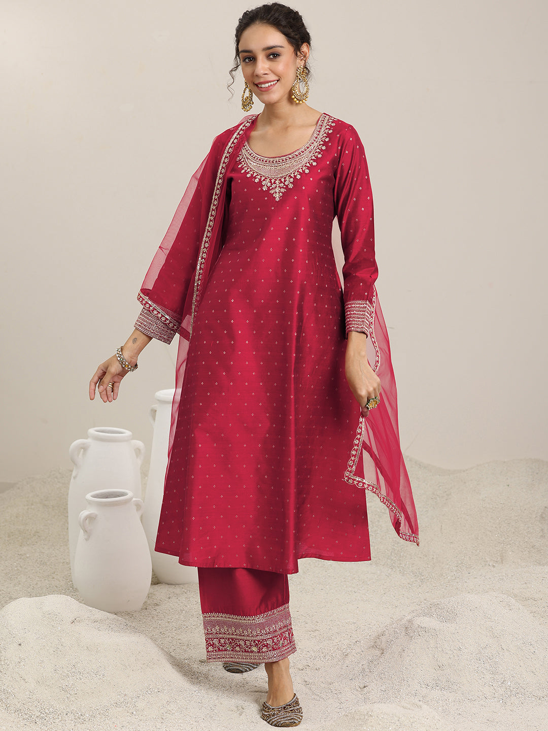 Maroon Woven Design Chanderi Silk A-Line Kurta With Palazzos & Dupatta