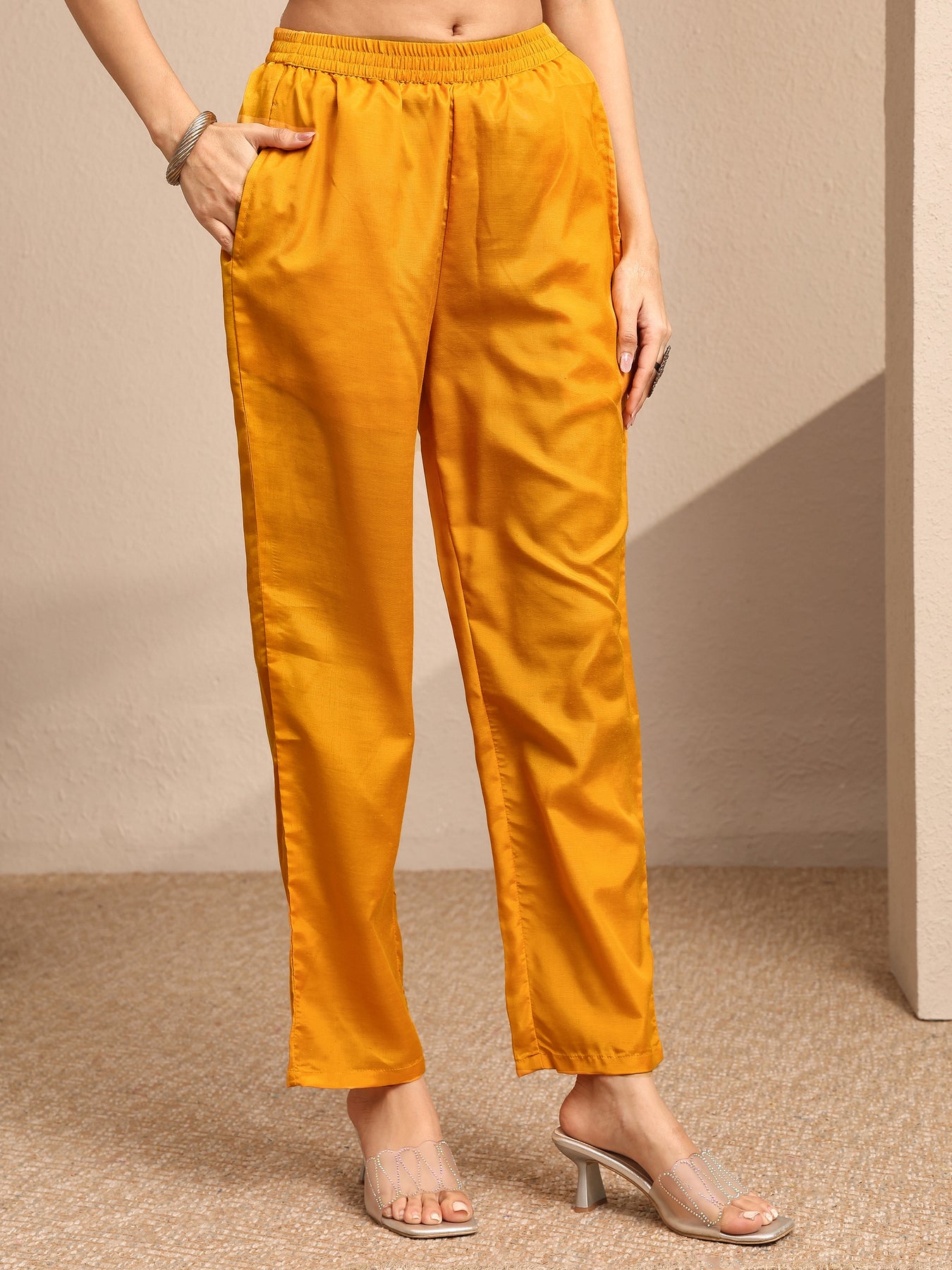 Our 3-piece orange silk blend kurta set features a straight-fit design with a round neckline, regular sleeves, and statement yoke. Complemented with straight pants with a partially elasticated waistband and a printed dupatta. Adorned with ethnic motif printed, this style is perfect for festive occasions.