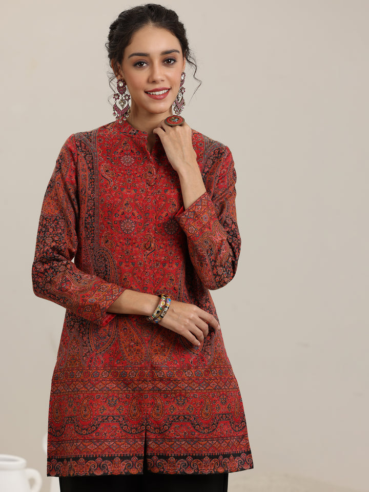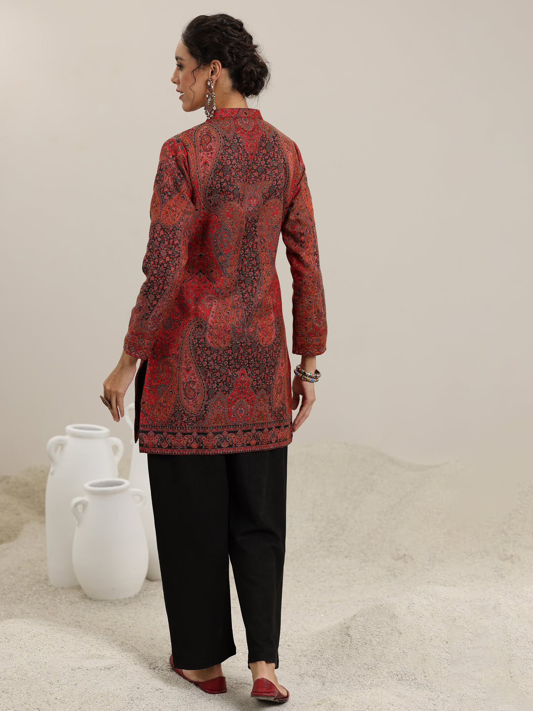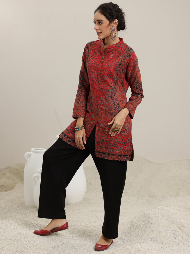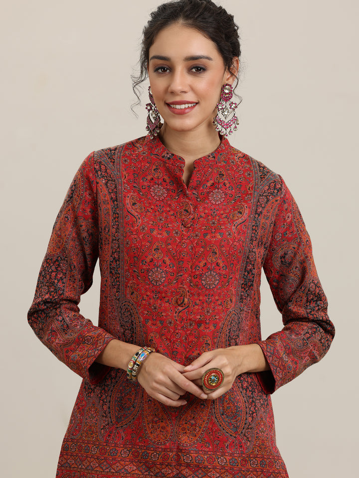 Our 2-piece multicolour woven design wool blend kurta set features a mandarin straight-fit front-slit kurta with a mandarin notched neckline and comfortable full sleeves. Complemented with palazzo pants with a partially elasticated waistband and roomy pockets. Elevated with floral prints and stylish button accents, this style is perfect for casual outings.
