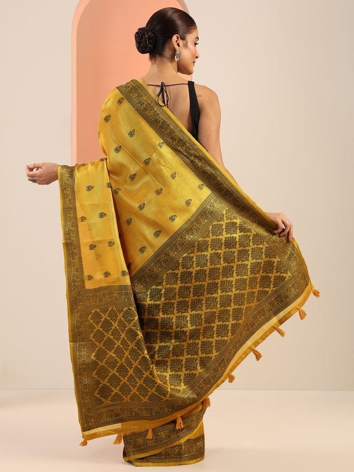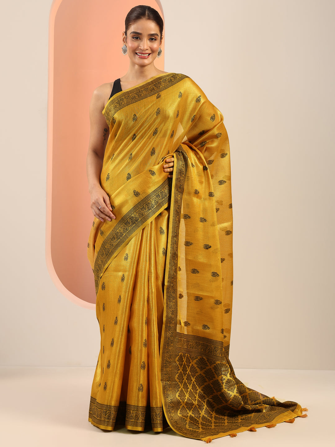 Our Mustard Embellished Silk Blend Saree Features Captivating Woven Print. Complemented With An Unstitched Blouse Piece. This Charming Saree Is Perfect For Festive Wear