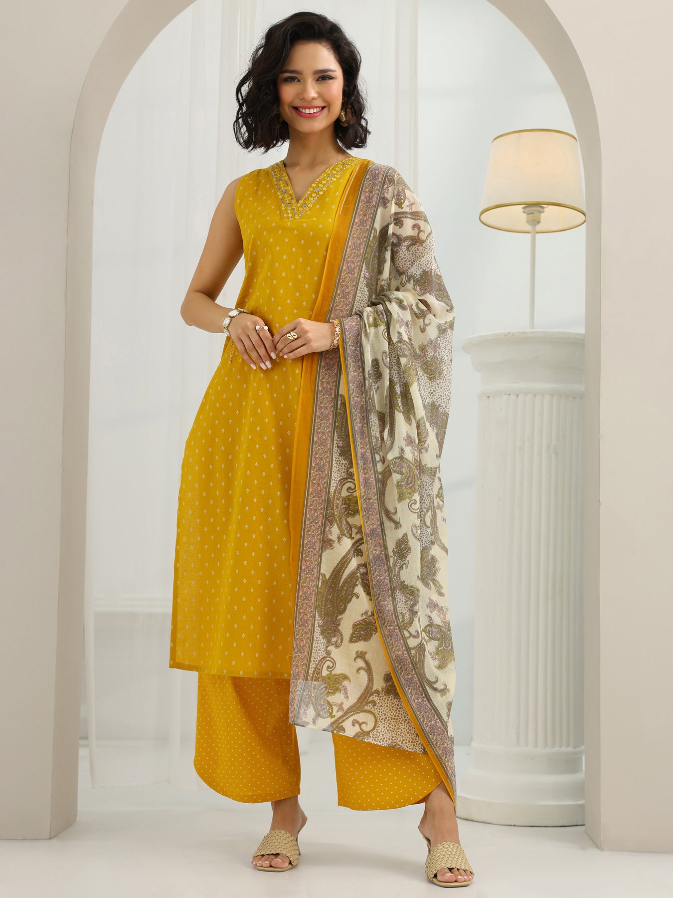 Our 3-piece yellow cotton straight-fit kurta set features a V-neckline and statement yoke. Complemented with palazzo pants with a partially elasticated waistband and a printed dupatta. Adorned with motifs printed, this style is perfect for casual wear.