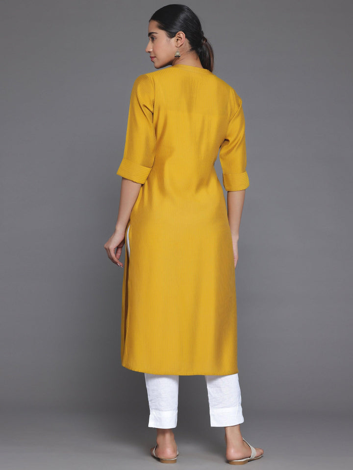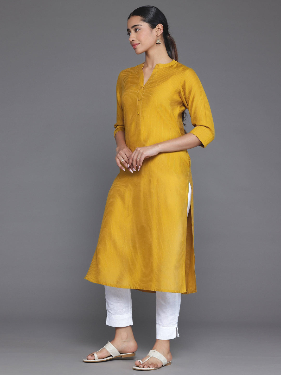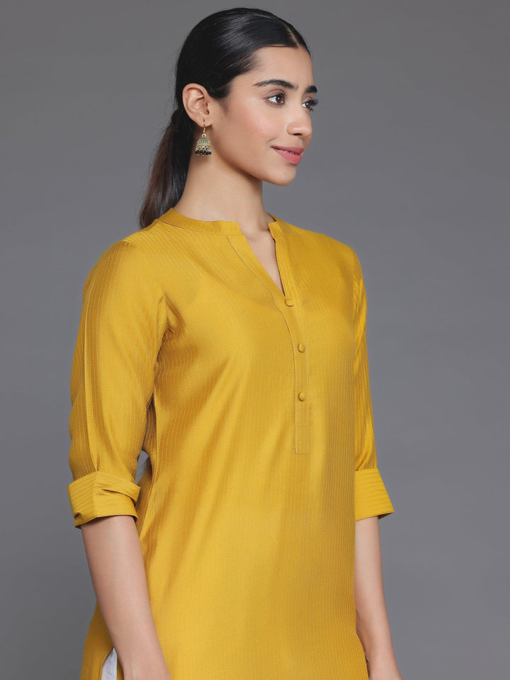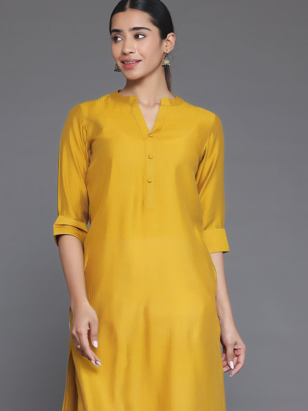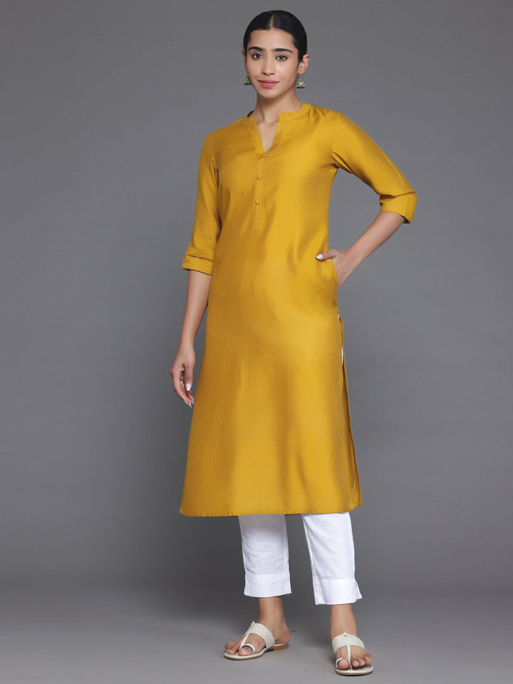 Our mustard yellow striped silk kurta features a mandarin notched neckline and three-quarter sleeves. Elevated with stylish buttons and pocket detailing, this style is perfect for casual outings.
