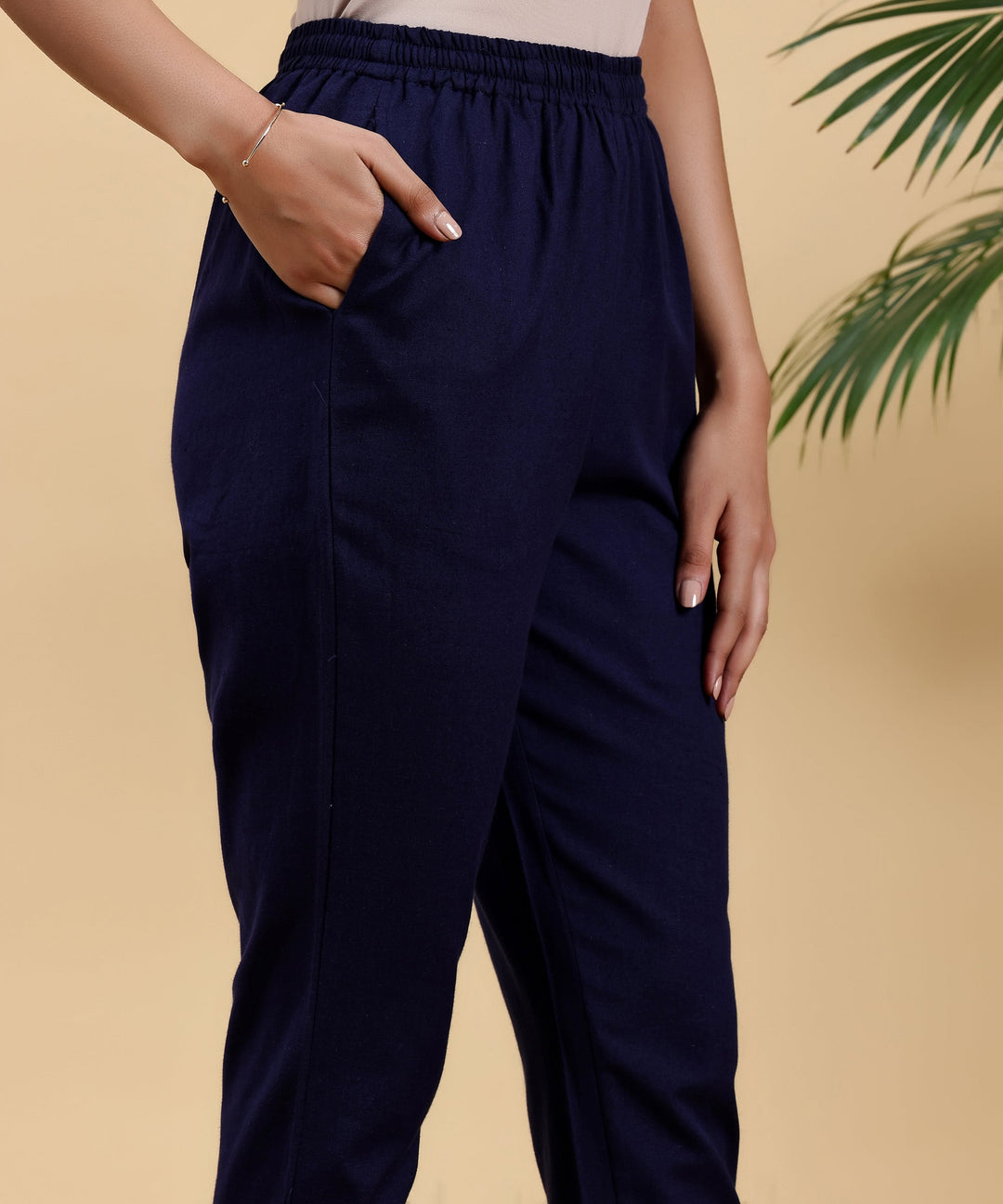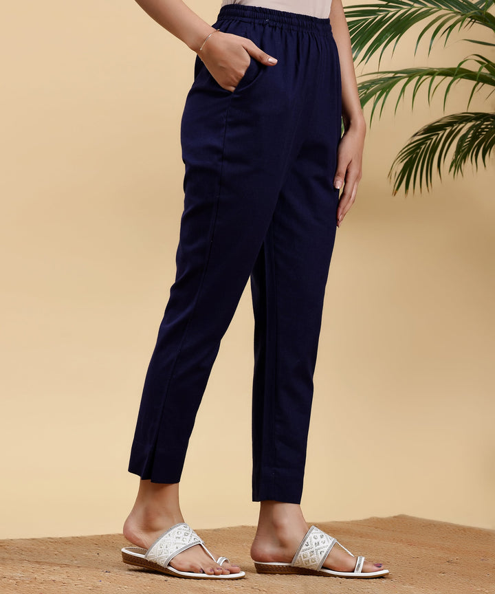 Our navy blue mid-rise trousers, crafted in cotton fabric, feature a fully elasticated waistband and roomy pockets are an ideal fit for casual outings.