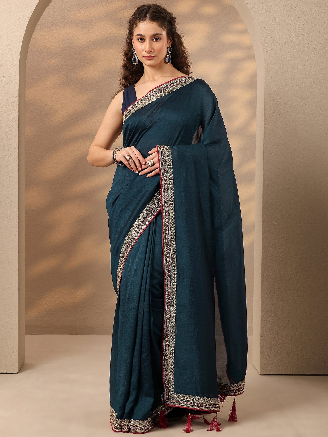 Our Navy Blue Solid Sarees Silk Blend Saree Features Captivating Solid. Complemented With An Unstitched Blouse Piece. This Charming Saree Is Perfect For Festive Occasions.