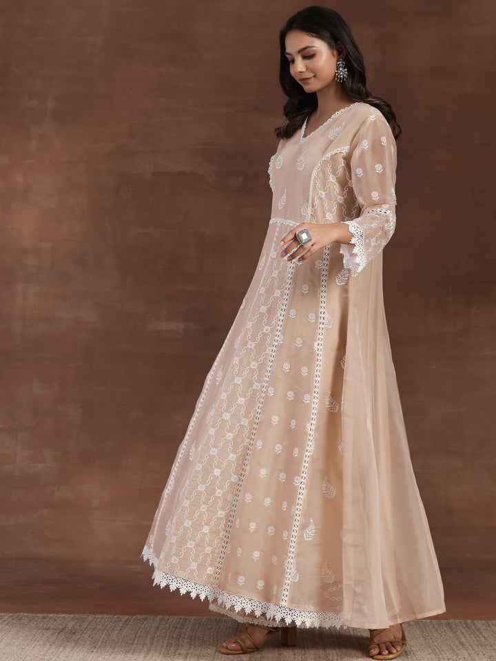 Nude Embroidered Organza A-Line Kurta With Palazzos & Dupatta