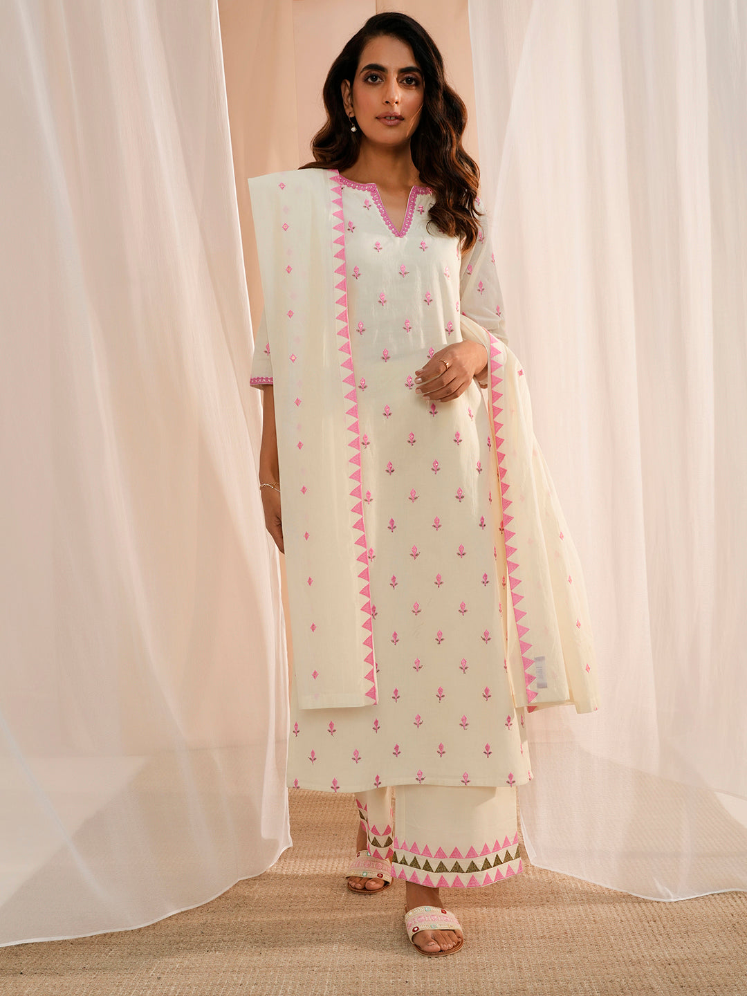 Off White Embroidered Cotton Straight Kurta With Palazzos & Dupatta