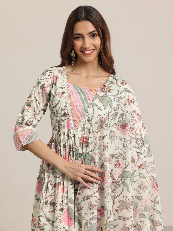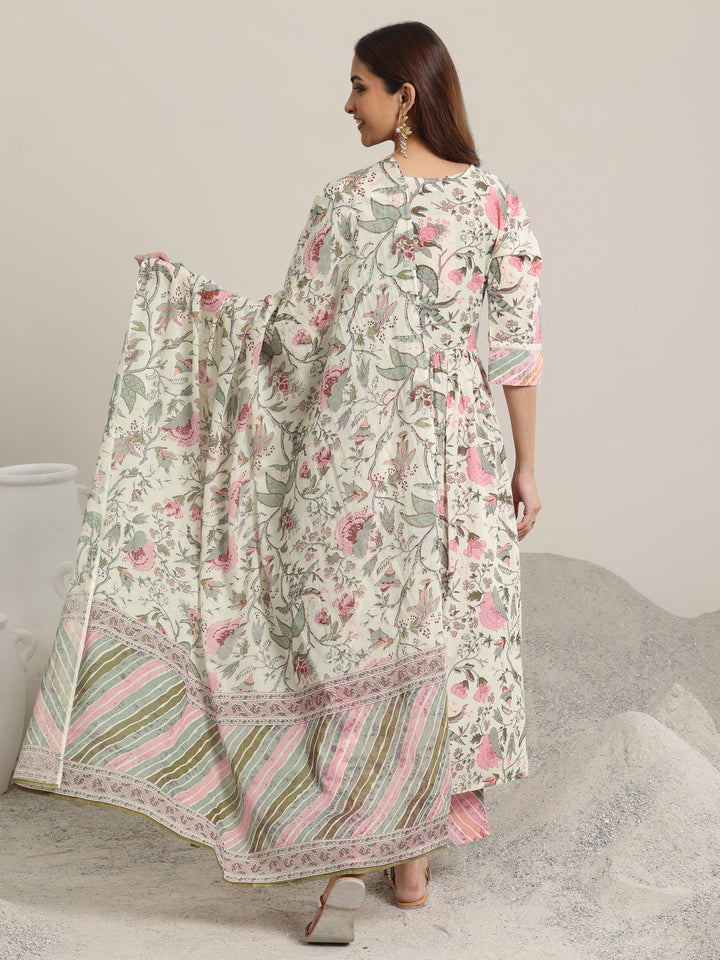 Off white Printed Cotton Anarkali Suit Set With Dupatta