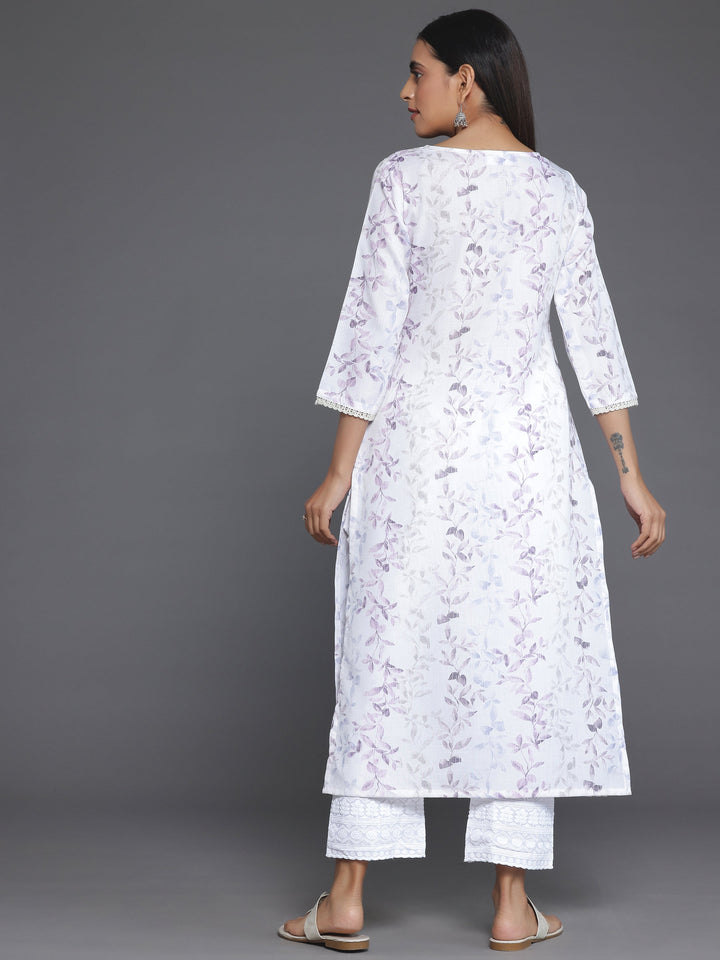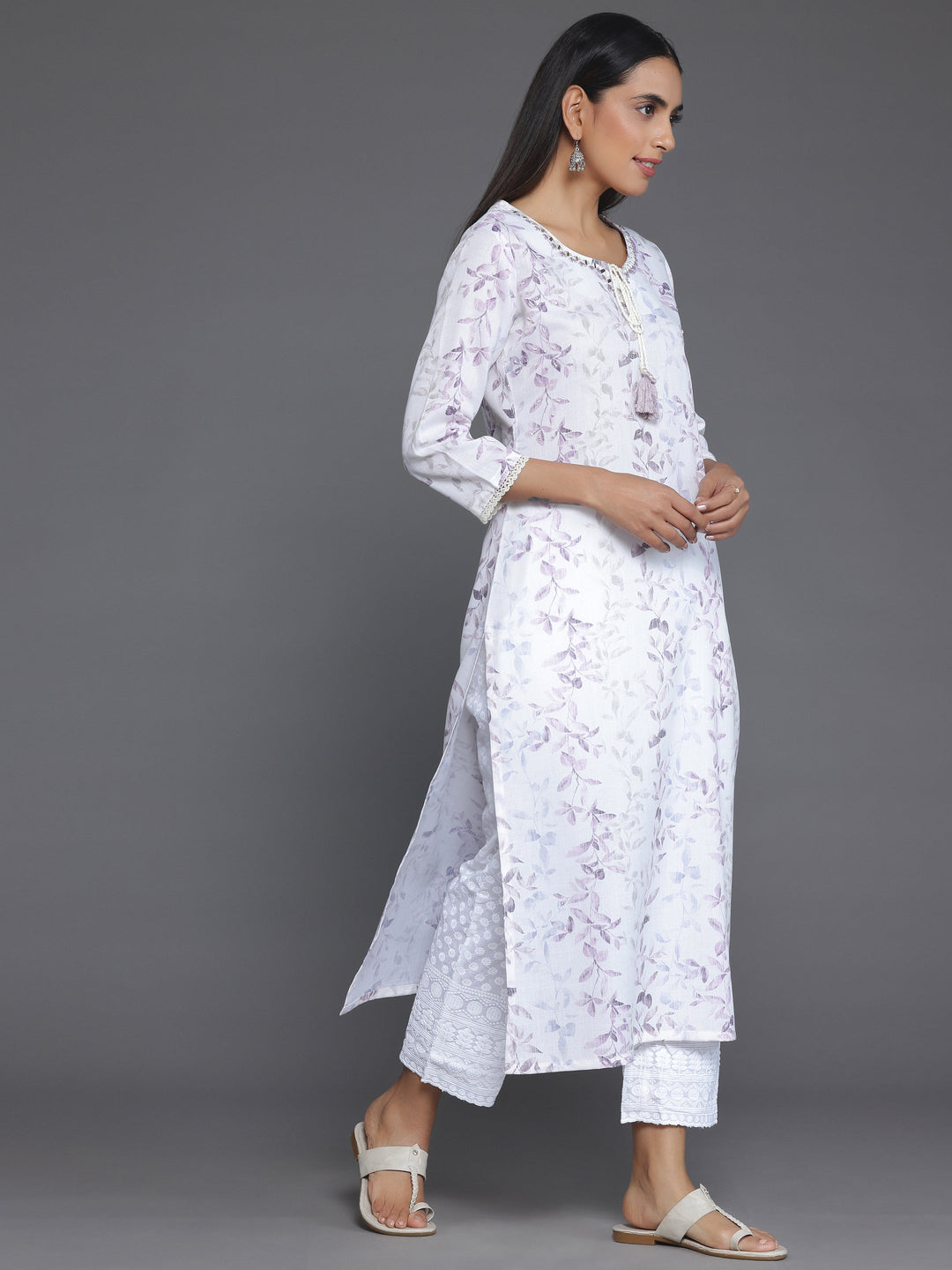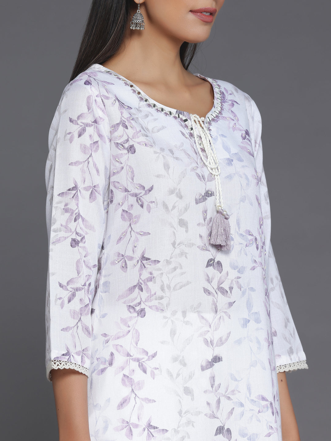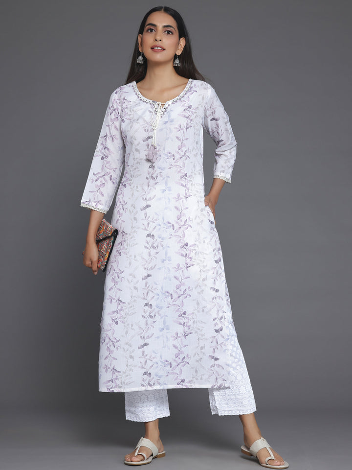 Our off-white printed straight-fit cotton kurta features a keyhole neckline with tie-up closure and a statement yoke. Adorned with mirror accents, dori-tassels, and sequins, this style is perfect for casual outings.