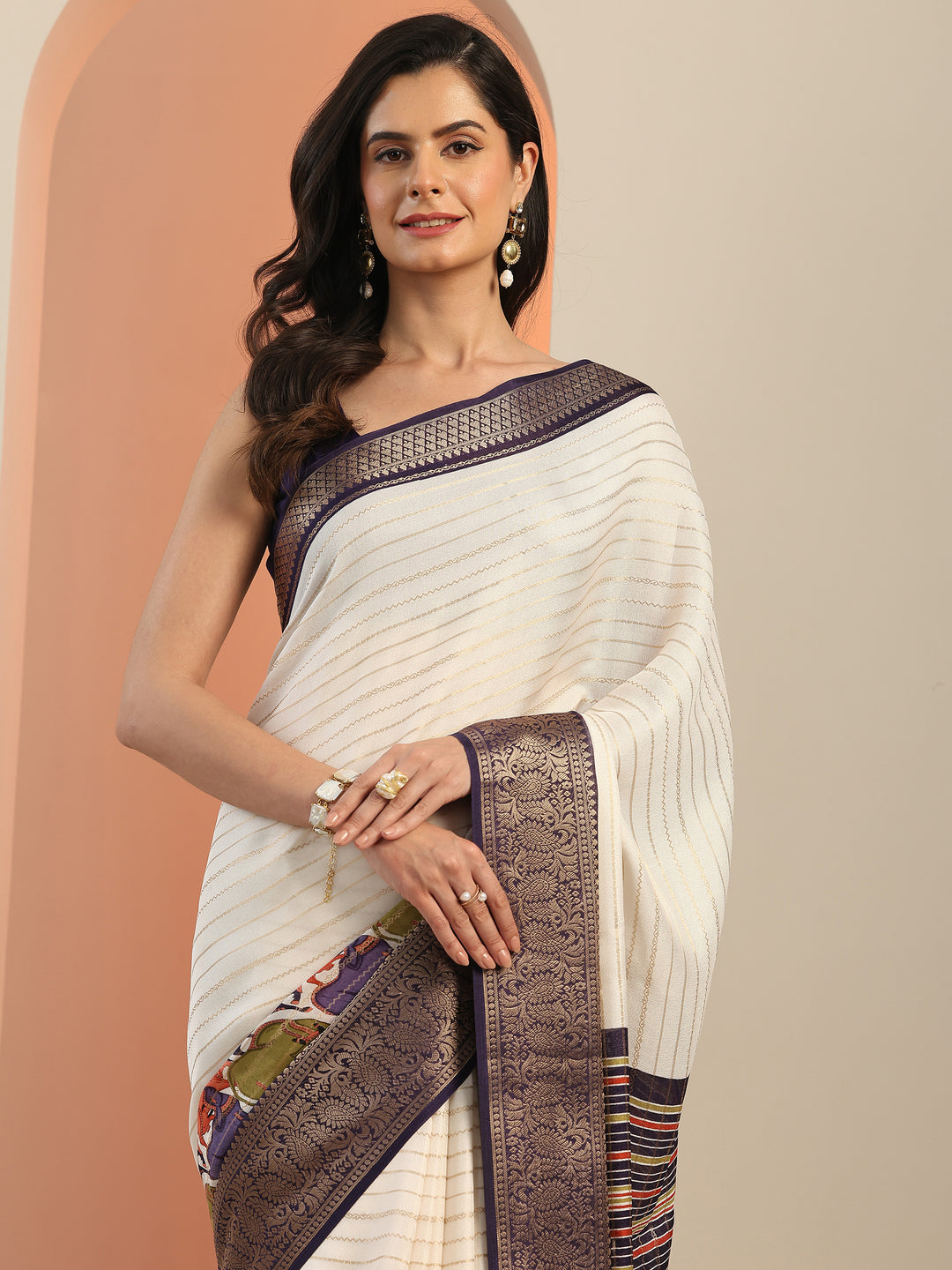 Off White Kalamkari Printed Silk Blend Saree With Unstitched Blouse Piece