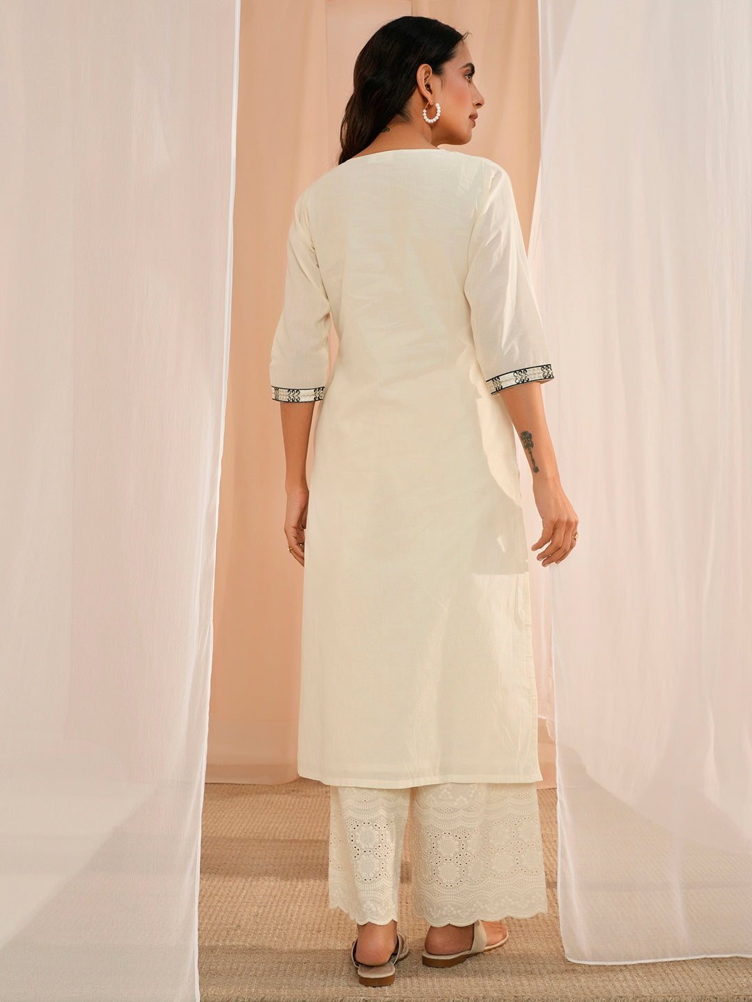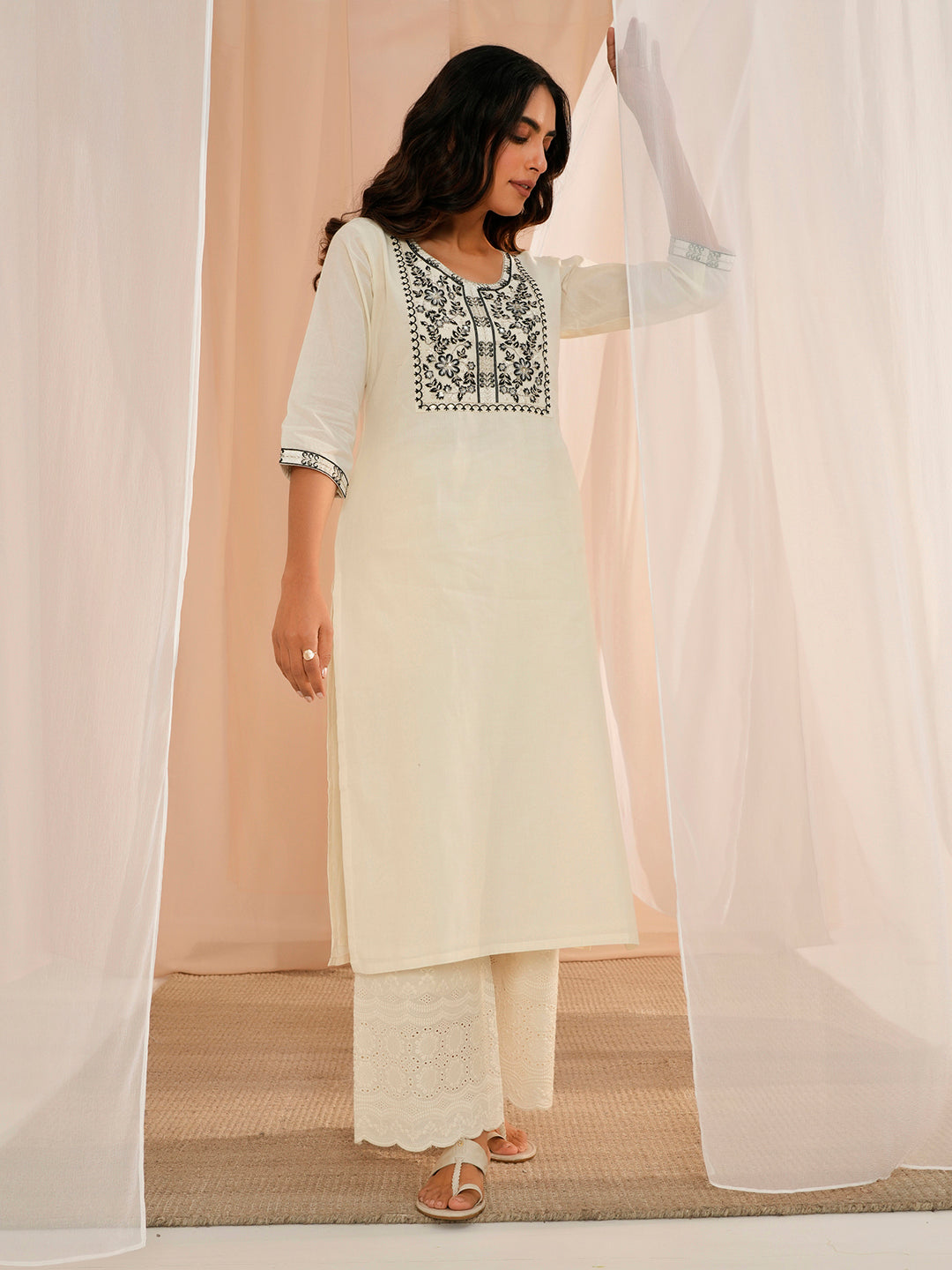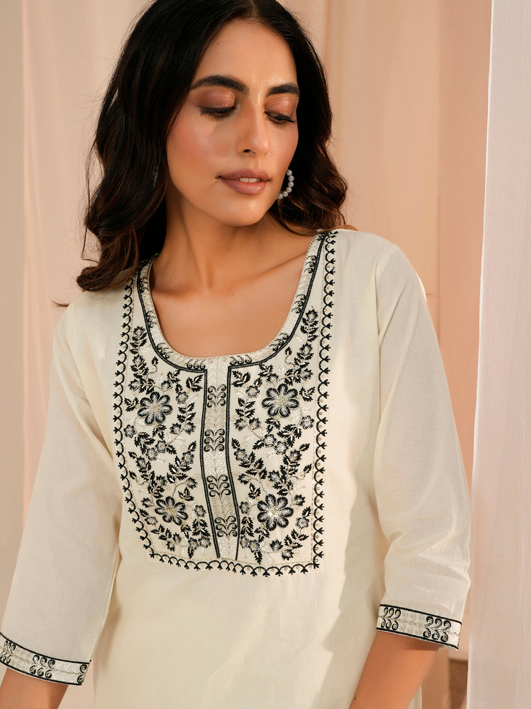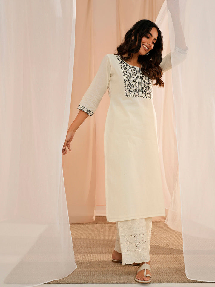 Our off-white embroidered cotton kurta features a straight silhouette with a round neckline, three-quarter sleeves, and a statement yoke. Elevated with charming sequins and floral embroidery, this style is perfect for elevated everyday wear.