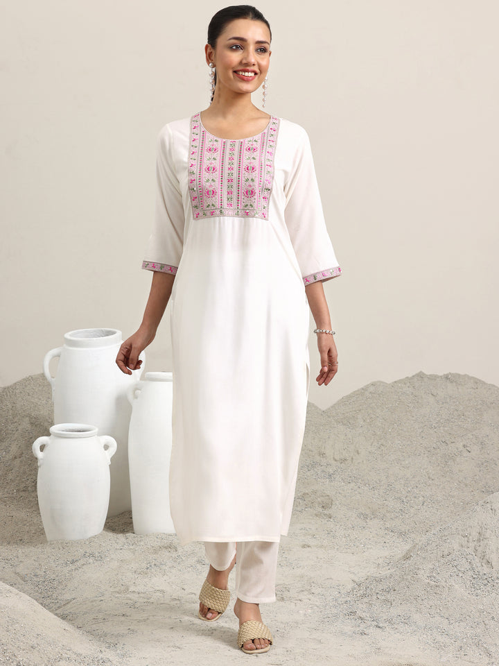 Our off white yoke design rayon straight kurta set features a round neckline, three-quarter sleeves, and a statement yoke. Highlighted with intricate thread work and sequins, this style is perfect for casual outings.