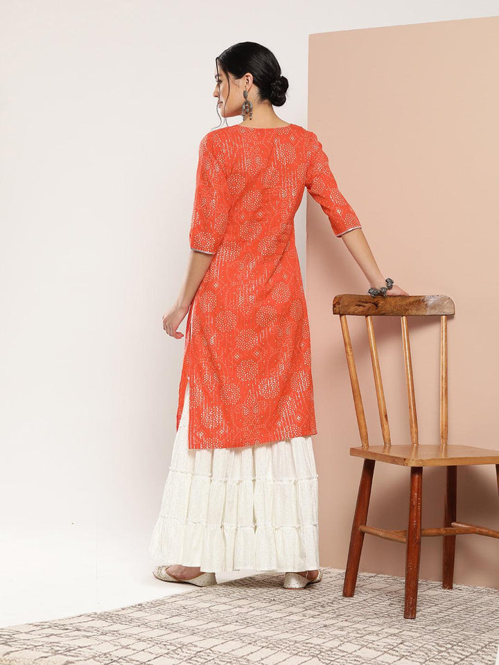 Our orange Bandhani inspired print straight-fit cotton kurta features a round neckline and three-quarter sleeves. Adorned with delicate Gota Patti accents, this comfortable style is ideal for casual outings.