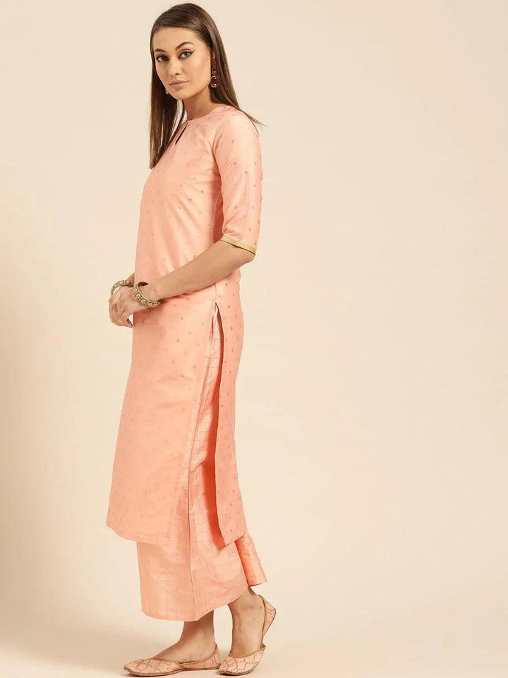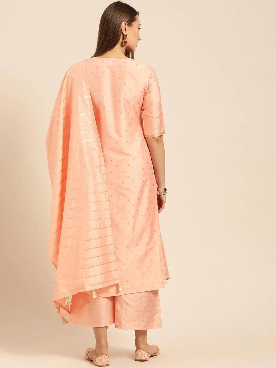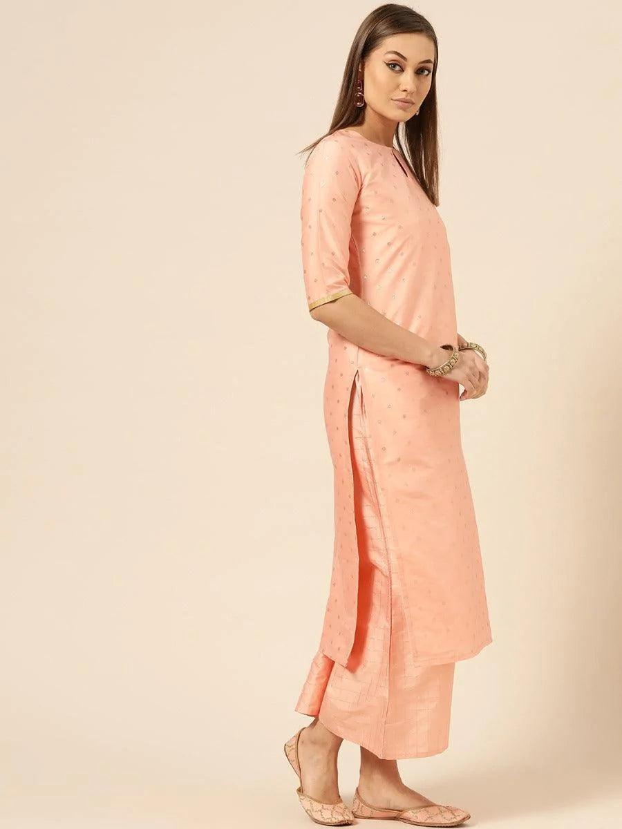 For the lovers of chanderi kurtas, this suit set in peachy pink color is just apt. It is a set of three, a straight cut kurta, straight palazzo pants and dupatta. Kurta is designed in straight silhouette with bold golden zari work. Adding grace to this ensemble is a golden checkered palazzo and golden self striped kurta with tassels border. This piece is a stylish option for a nice family function or event when teamed with heavy earrings and a classic rajasthani mojris.