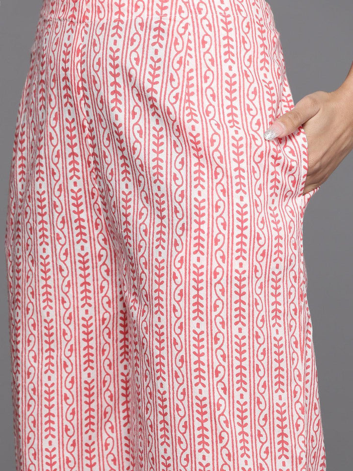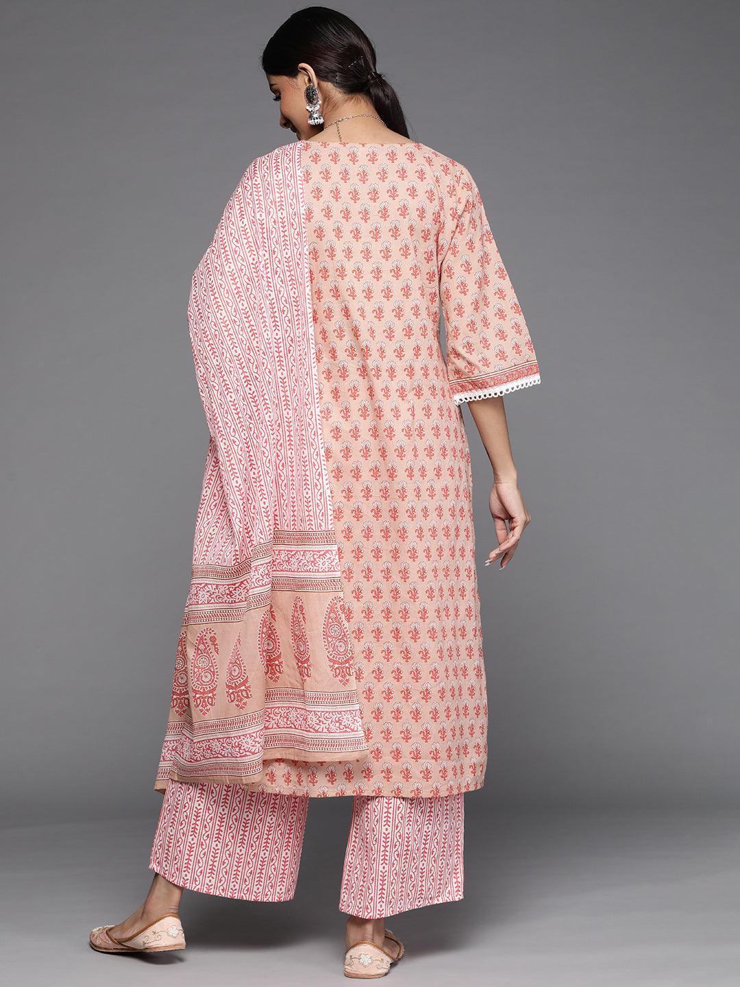 Our 3-piece peach printed cotton suit set features a straight-fit floral print kurta with a notched neckline and contrasting fabric and lace-trim accents on the yoke and sleeves, straight palazzo pants with a partially elasticated waistband and roomy pockets, and a complementing dupatta. Ideal pick for effortless everyday wear.