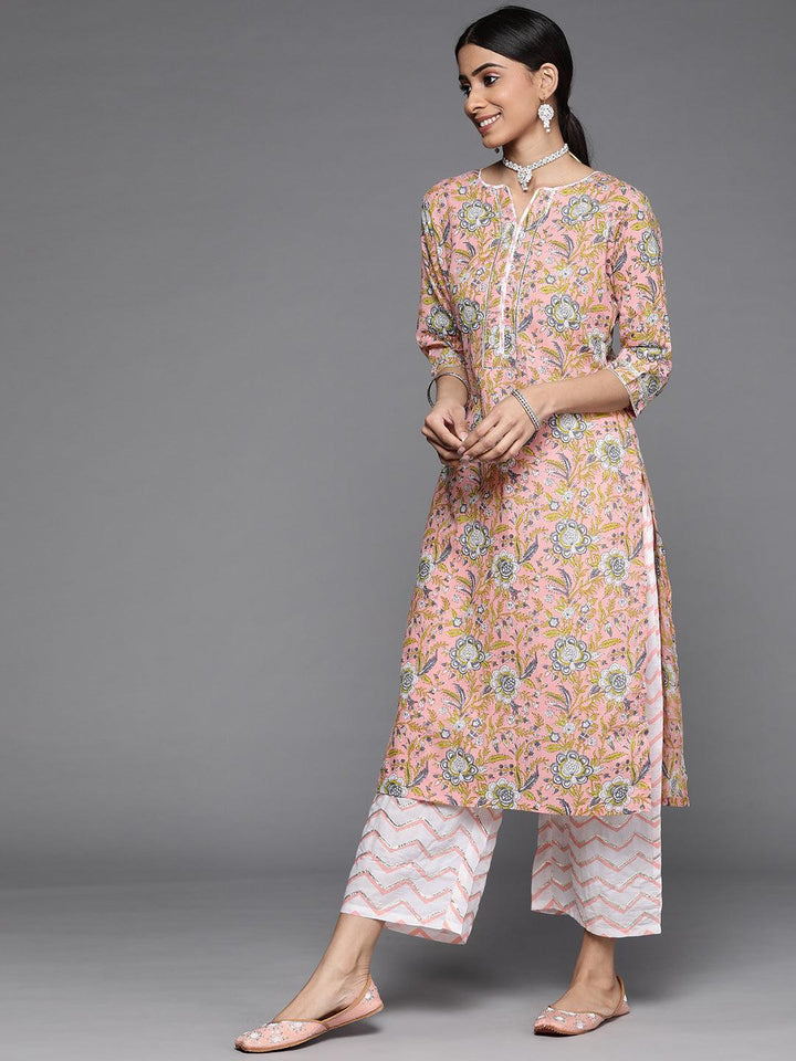 Our 3-piece peach printed cotton suit set features a floral print straight-fit, notched neckline kurta with Gota Patti accents on the yoke and sleeves, straight palazzo pants with a partially elasticated waistband and roomy pockets in a contrasting chevron print, and a woven organza dupatta. Perfect for effortless everyday wear.